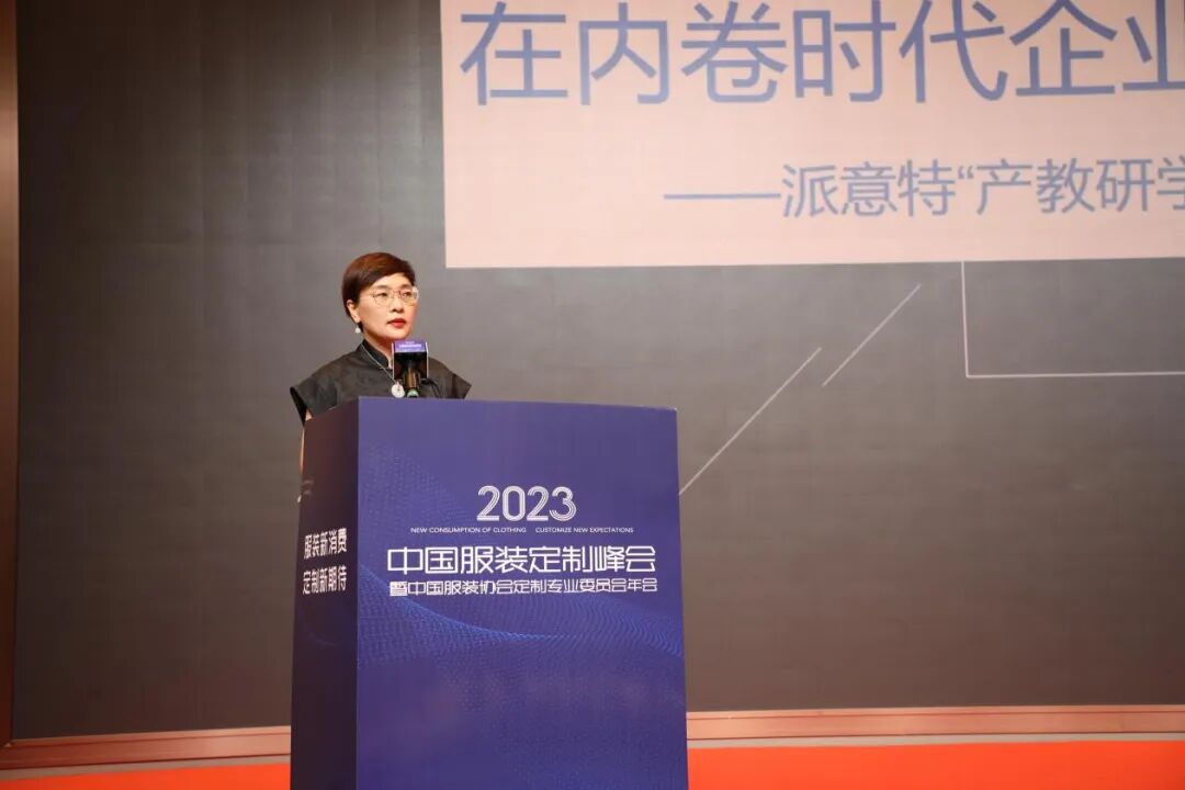 派意特集团兼衣央新商务装定制局董事长姜学军以《在内卷时代企业如何生存发展》为主题进行分享。她指出,随着行业竞争愈加激烈,制约企业发展的因素已经不再是产品,而是人才。派意特通过构建“产教研学商”生态发展体系,致力成为中国职业装专家、中国新商务女装定制引领者和中国服装专业职业教育头部职校,希望以高素质人才为基石,更好地赋能定制产业。