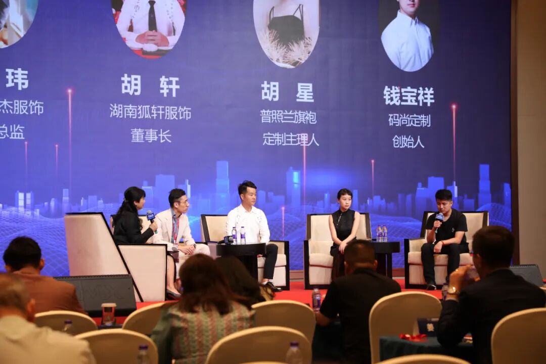 在科技赋能和消费升级驱动下,依托互联网、云计算、人工智能等新技术的深化应用,新型消费正蓬勃发展。在嘉宾对话环节,夏梦·意杰服饰高定总监黄玮、湖南狐轩服饰董事长胡轩、普照兰旗袍定制主理人胡星、码尚定制创始人钱宝祥就《数智赋能下服装定制企业如何发力新消费》展开讨论,深度剖析了数字消费时代,服装定制企业如何发展新业态、新模式、新场景,为定制企业数智化转型疏通难点,提供建议,引起了现场观众的共鸣。湖南艺术职业学院设计艺术学院院长周朝晖主持对话环节。