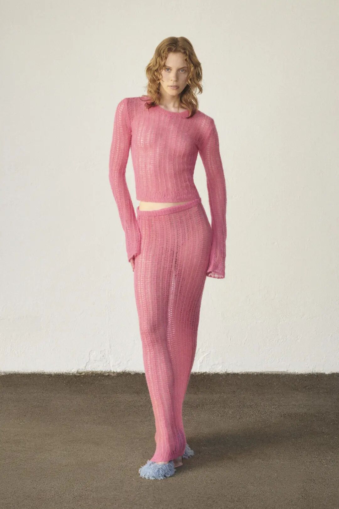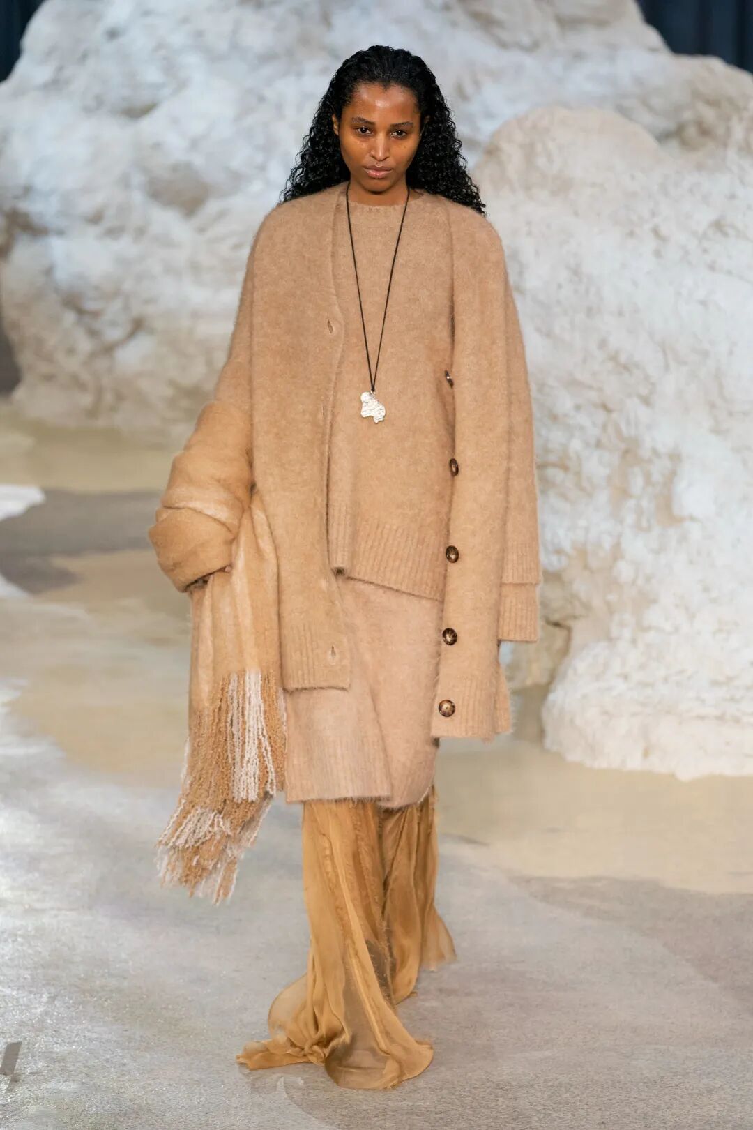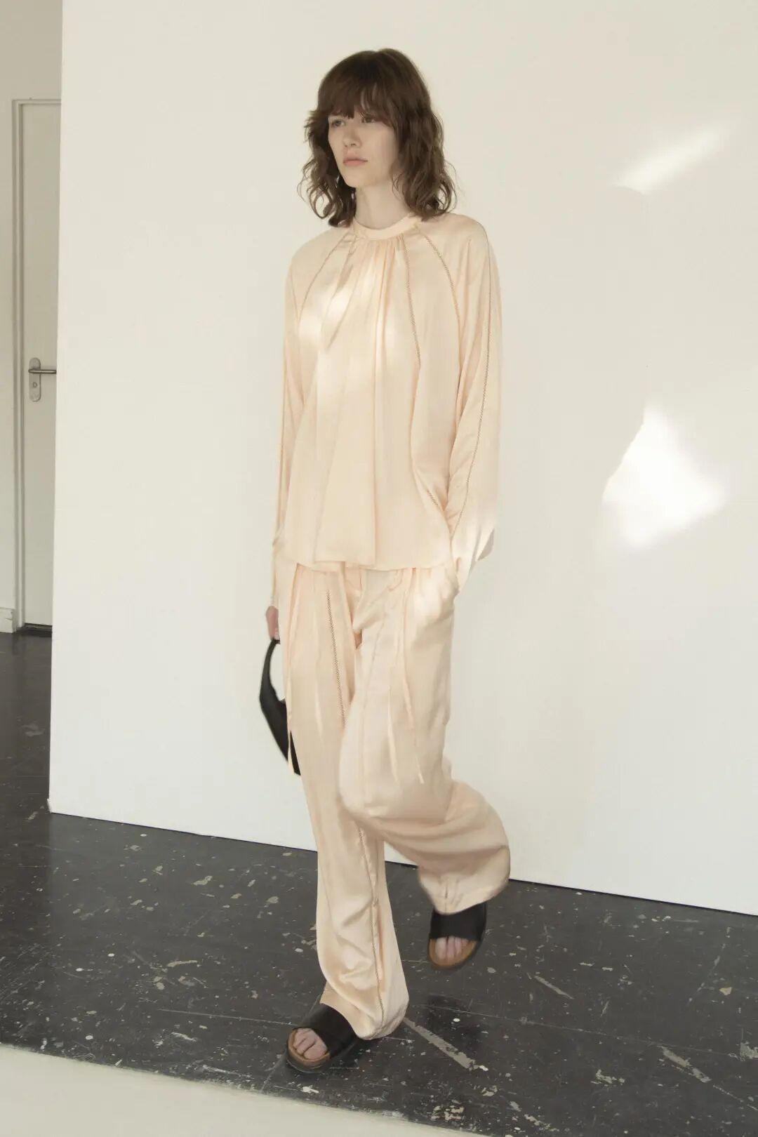 2024度假系列的家居服套装继续向盛装、外出活动的方向发展。光泽柔和的丝质材料具有柔软流动性,与闺房装扮主题相得益彰。精细镂空针织和纹理材质轻巧便携,适合舒适度假造型。罩衫套装是保守和青睐百搭上衣连衣裙二合一的消费者的理想之选。