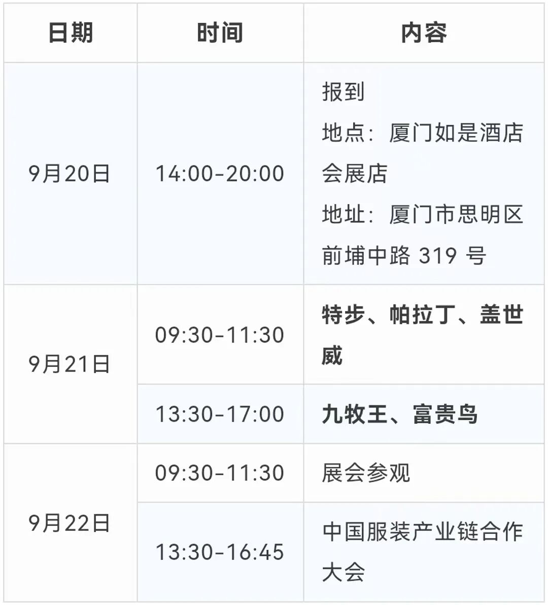 2023中国服装产业链合作大会暨中国服装协会关联产业专业委员会年会将于2023年9月22日在厦门国际会议展览中心举行。为加强服装品牌企业与优秀关联企业之间的高效对接和信息交流,加快设计创新、生产方式、营销模式和价值创造的转变,中国服装协会将在会议同期举办LINKINGplus—“走进厦门”品牌对接活动,活动将组织关联企业走进厦门知名品牌企业进行实地探访与直面交流,本次活动日程如下: