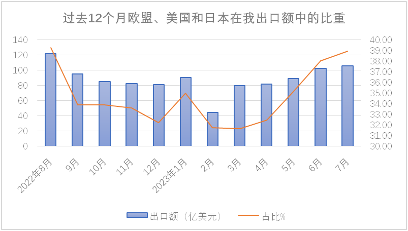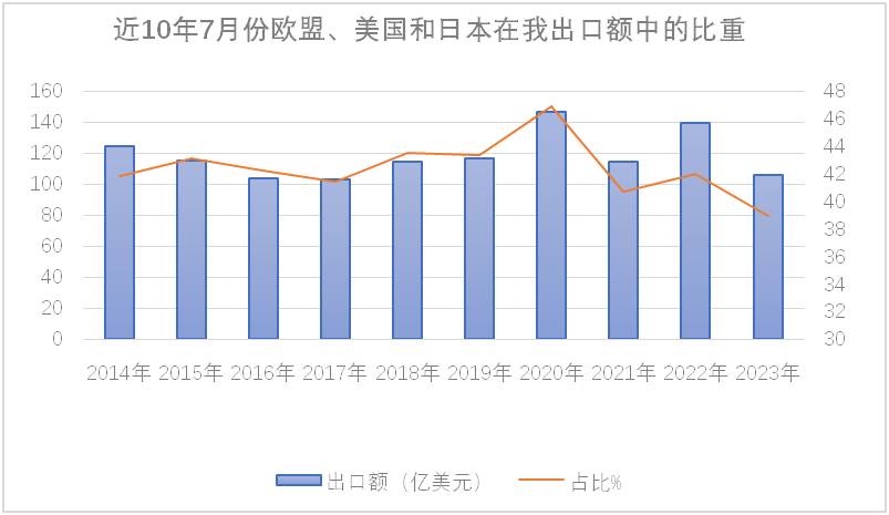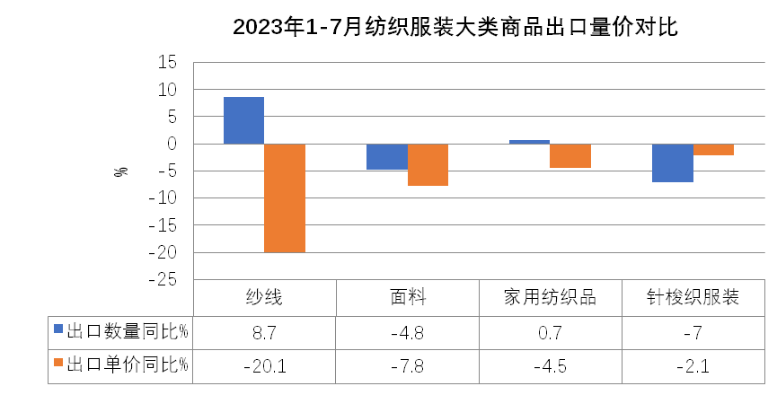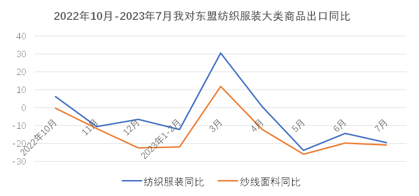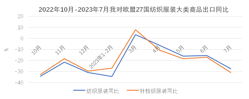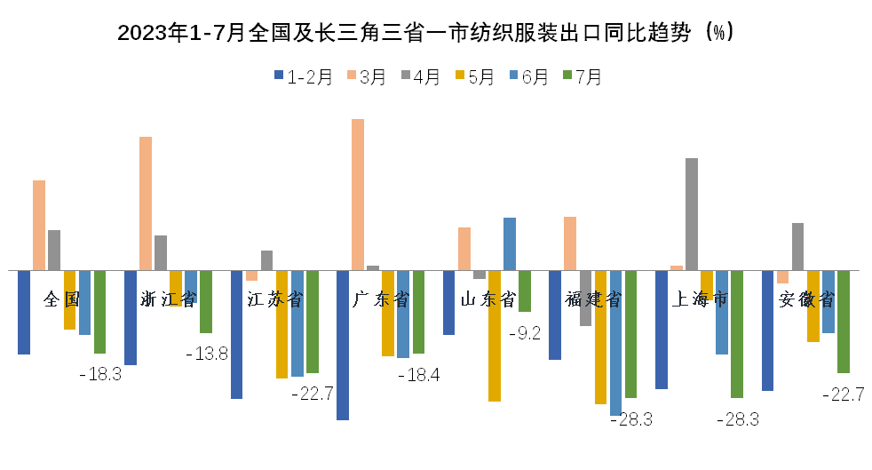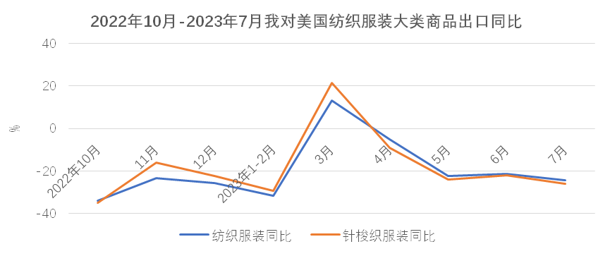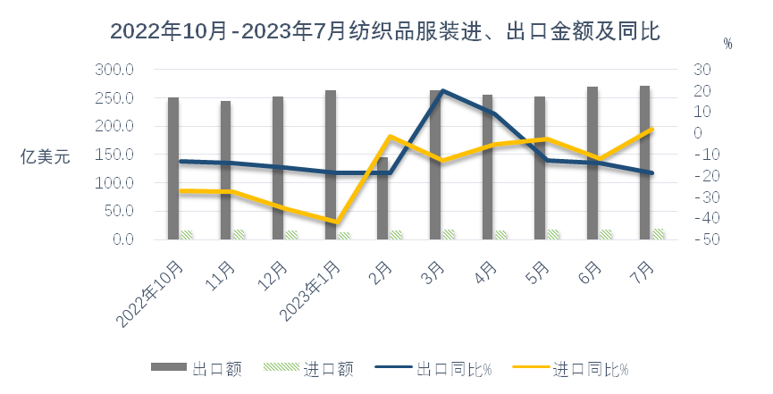 外需不足与极端天气对7月出口造成负面影响,基数高致出口降幅进一步扩大。三季度首月一般是开启下半年出口高峰的时段,三季度的出口表现对于全年具有重要指标性意义。而今年7月纺织服装出口依然缺乏增长动能,当月出口额仅及270亿美元,同比继5、6两月后连续第三个月两位数下降,且降幅进一步扩大至18.3%,环比也仅增长了0.4%,与疫情前的正常年份相较差之甚远。下降的首要原因仍是外需不足。从美国、欧盟和日本的进口情况看,上半年三大重点市场纺织服装进口分别下降23.6%,13.5%和3.5%,其中6月的降速仍然较快。其次,7月的极端恶劣天气雪上加霜,“泰利”、“杜苏芮”台风先后登陆我国沿海和内陆地区,在东南、华南沿海等主要出口地区造成大面积破坏,多地出现洪涝灾害,部分企业停工停产,港口停运,致部分订单无法按时交期。此外,出口同比基数大也是导致7月出口大幅下降的重要原因,去年7月出口额在量、价的共同推动下达到332亿美元,创单月出口历史新高,也是当年月度出口最高峰值。7-8月有较大可能是今年年内纺织服装出口的“至暗时刻”,之后我们预计会有一些积极因素出现。一是虽然美国市场形势不佳,中国在美市场占比和美占我出口比重双向下降,但美国仍是我第一大单一市场,其恢复与否和恢复程度对全球终端产品和中间品贸易均有重要引领作用。近期美经济仍具韧性,通胀率持续下降,库存同比下行,对我出口形成良好预期。2022年3季度至2023年2季度,美国GDP环比折年率分别为3.2%、2.6%、2.0%和2.4%,重回正增长态势;美国7月CPI同比增速已下降至3.2%,6月制造业库存同比下降至-0.3%。二是同比基数逐步下行。去年除8月仍较高外,9-12月出口额均缩至300亿美元以下,各月同比均为负增长,且降幅逐月扩大,三季度累计增长5.6%,四季度累计下降14.6%,为今年四季度出口反弹留出空间。国内经济尚正处于疫情后的调整恢复阶段,全球经济复苏曲折缓慢,市场需求不会在短期内迅速复原,地缘政治因素造成的负面效应亦将长期发酵。针对不利形势,近期中央明确释放了扩内需稳增长的宏观调控信号,在扩大消费内需、稳定民营经济、改善营商环境、提升外商投资等方面密集出台了系列稳增长的政策,提振市场主体的预期与信心。我纺服出口企业此时需“强信心,稳定力,促升级”,加强企业内部管理,根据形势变化迅速调整经营方略,保住老客户,试水新客户、新产品、新贸易方式,构建双循环结合,拓展跨境电商渠道,布局新赛道,从国内外竞争激烈的红海中突围。2023年1-7月,全国货物贸易进出口总值34002.4亿美元,同比(下同)下降6.1%,其中出口19449.0亿美元,下降5%,进口14553.4亿美元,下降7.6%,累计贸易顺差4895.6亿美元。2023年7月,全国货物贸易进出口总值4829.2亿美元,同比(下同)下降13.6%,其中出口2817.6亿美元,下降14.5%,进口2011.6亿美元,下降12.4%,贸易顺差806亿美元。1-7月,纺织品服装贸易额1816.7亿美元,同比下降10.5%,其中出口1697.9亿美元,下降10.4%,进口118.7亿美元,下降11.7%,累计贸易顺差1579.2亿美元,下降10.3%。7月,纺织品服装贸易额290.1亿美元,同比下降17.2%,其中出口271.1亿美元,下降18.3%,进口18.9亿美元,增长2.3%,当月贸易顺差252.2亿美元,下降19.5%。全球经济复苏缓慢,发达经济体增长乏力。美国今年上半年经济增长2.4%,欧盟今年二季度经济环比零增长,欧盟领头羊德国更是连续两个季度环比负增长,德国央行预计三季度德国经济将继续停滞。国际需求继续收缩,订单下滑,加上美国推动对我“脱钩断链”和采购链重塑,我纺织服装出口继续承压。7月我国纺织服装出口271.1亿美元,环比微增0.4%,但同比大幅下降18.3%,降幅连续两个月扩大。二、欧美日占我出口市场的份额有所回升,但“西降东升”仍是市场格局调整的主旋律7月,我对欧盟、美国和日本三个传统市场合计出口105.6亿美元,占我出口总额的38.95%。今年2月和3月,三大传统市场占我出口比重连续两月低于32%,自3月开始,占比逐步回升,6月和7月均高于38%。但值得注意的是,6-8月是我对欧美日市场出口的旺季,通常上述月份欧美日在我出口中的比重高于其他月份。过去几年的7月,欧美日所占我出口比重均超过40%,今年为过去10年首次跌破40%,说明“西降东升”的变化趋势仍在继续。从1-7月累计数据看,我对欧美日共出口594.3亿美元,占比为35%。7月出口数据显示,中亚及俄罗斯、西亚非洲仍是我纺织服装出口的亮点地区。在本月出口额超过1亿美元的市场中,同比上升的有6个国家,分别是哈萨克斯坦(22.75%)、俄罗斯(13.31%)、土耳其(0.73%)、伊拉克(4.37%)、阿尔及利亚(118.15%)和坦桑尼亚(12.99%)。从1-7月数据看,出口额超过7亿美元的45个国家和地区中,保持增长的有韩国、吉尔吉斯斯坦、俄罗斯、马来西亚、哈萨克斯坦、沙特阿拉伯、巴西、新加坡、土耳其、伊拉克、阿尔及利亚和坦桑尼亚等12个国家。东盟—受欧美需求下降的传导影响,我对东盟出口增长动能持续减弱。7月我对东盟出口38亿美元,同比下降19.3%,超过我出口整体降幅。其中,出口纱线面料18.1亿美元,下降20.8%。分国别看,本月我对越南出口13.2亿美元,下降8.3%,降幅大幅收窄。1-7月,累计对东盟出口291.9亿美元,下降9.5%,其中纱线面料累计出口143.6亿美元,下降16.2%;服装出口91.1亿美元,增长7%。美国—对美出口继续下跌。7月对美出口47亿美元,下降24.1%。从5月的22.2%、6月的21.1%,到本月的2