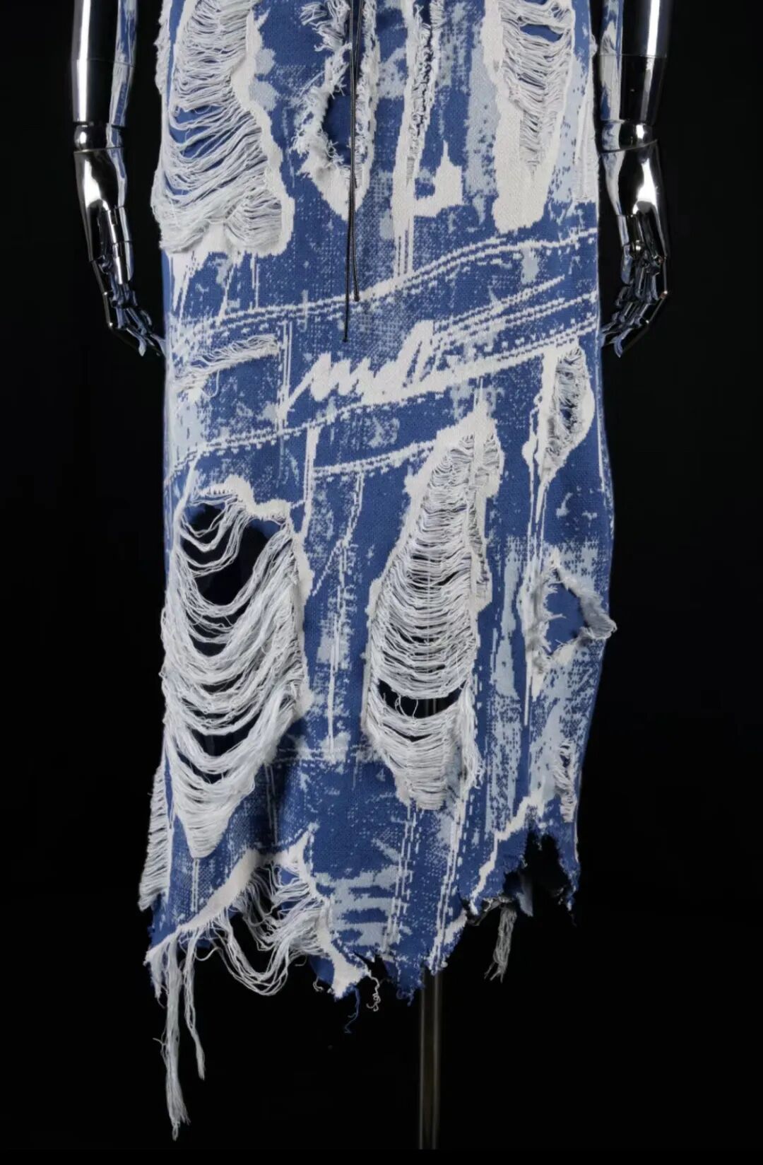 破损做旧是针织服装重点关注的设计点,在服装的下摆、领口、袖口等部位做破坏设计,可直接剪开,使纱线肆意脱散,也可在破损处进行手缝效果装饰,使毛衫呈现破旧的复古气质,更有一种雅痞休闲随意的时尚感受。