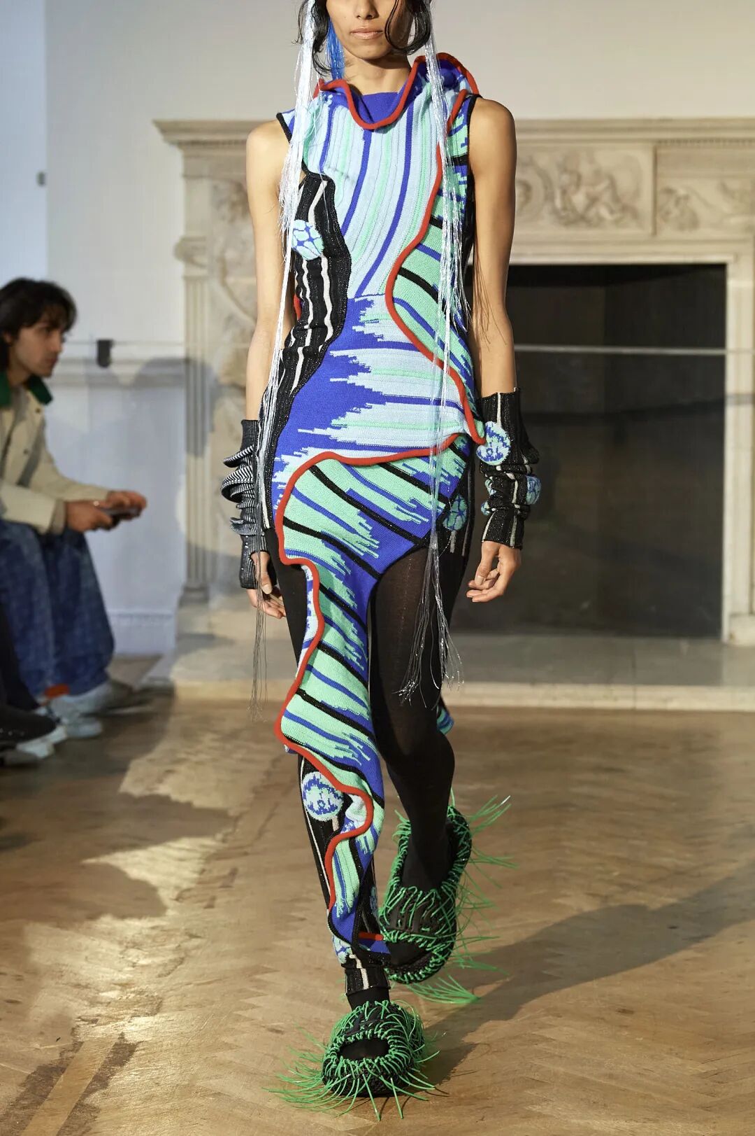 设计师们将多种质感针织面料相搭配,营造类似于补丁样式的装饰效果,打造出复古的服装质感碰撞,使得针织在服装中的运用创造出无限可能。