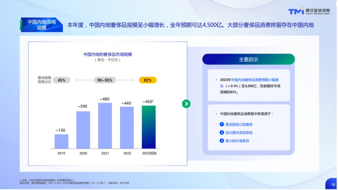 2023 年,中国内地奢侈品消费预期小幅增长至 4500 亿元,贡献整体市场规模的 82%