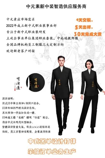 中元素成立于2015年,总部位于厦门。品牌诞生之初,设计师何文浩先生以及他的团队在积累十年工装设计制作经验的基础上,就已经在不间断地为自己以及身边文化圈、艺术圈的朋友定制易穿着、高品质、有文化感的服装。公司产品以“新中装”为研发核心,以唐装、旗袍等高级定制为主营业务。以“向世界讲好中国华服故事,让中国华服走向世界,成为引领全球的时尚”为使命,通过与全国服装定制门店、茶艺会所、东方珠艺、国学堂、婚庆定制以及生活美学集成店等异业开展灵活多方位的跨界合作,迅速推动私人定制发展,引领中式男装潮流。b. 订单消费或预存货款满20000元,总价按6.8折优惠;a.直接订货或预存1万元,按3.5折拿货(首次拿货不低于5000元);允许只需采购上衣(单款单件)。b.直接订货或预存3万元,按3.2折拿货(首次拿货不低于10000元);b.赠送三本布卡(净色套装料、提花礼服料册、国风衬衫料册)。