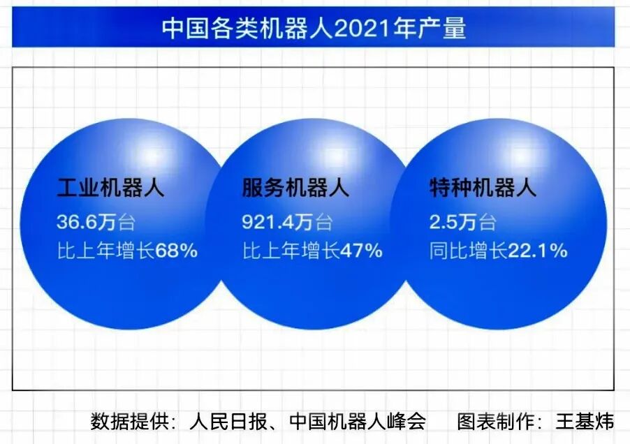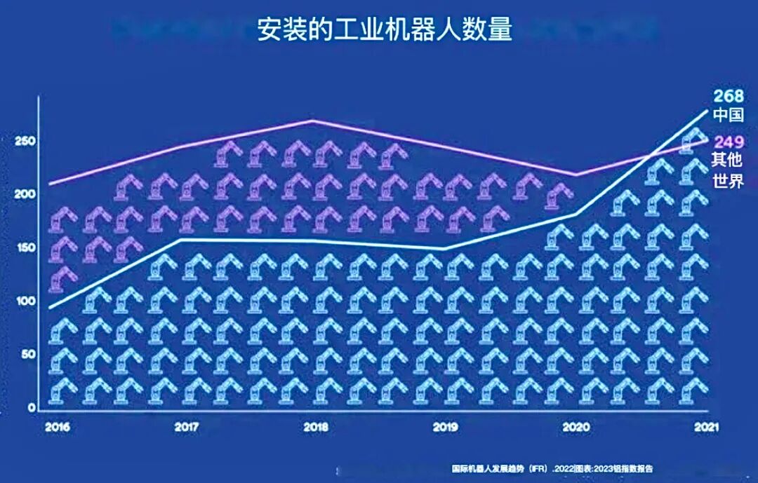 2021年底我国工信部等十五个部门联合印发的《“十四五”机器人产业发展规划》中提出两个发展指标,一是到2025年机器人产业营业收入年均增长速度要超过20%,二是制造业机器人密度要翻倍增长。2021年我国机器人总产量见图一,其中工业机器人年产达到36.6万台;据斯坦福2023年人工智能指数报告中说,2021年,中国安装的机器人总数达到268万台,安装量占全球的51.8%以上,超过了全球其他国家和地区的总和,见图二。在2022年世界智能制造大会上,我国工信部负责人表示,十年来,由于我国深入实施智能制造工程,智能制造应用规模和水平已进入全球领先行列,我国制造业机器人密度增长约13倍,2022年底已经达到每万名工人322台,稳居全球前列。