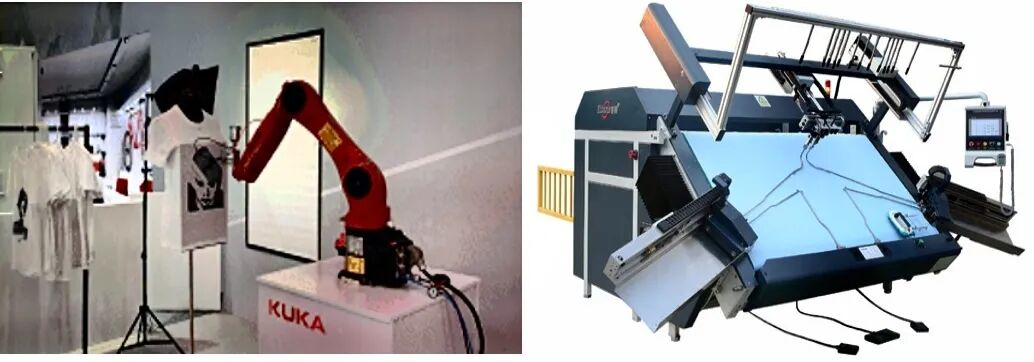 机器人抓手的研究水平在不断提高,现在已经可以实现对服装衣片的抓取和传送。针对衣物等柔软物品的抓取,常用的方法是采用灵活性好、接触面积大、摩擦力小的气动或者电动柔性抓手。同时,在控制方面也需要考虑到多点触控和变形感知等问题。另外,为了保证精准传送,还需要结合视觉识别技术来定位并精确操作。目前许多工业机器人都已经配备了视觉系统,并且能够通过学习算法自主地分辨出不同类的服装并进行相应处理。在服装制造领域,通常需要进行裁剪、缝纫、测量和折叠等任务,由于这些任务需要高度的灵活性和精准度,因此传统的自动化设备无法完全替代人工操作,但是随着技术的不断进步与成本的降低,在近年来出现了越来越多适用于服装制造业场景的智能机器人系统。例如,很多服装企业的智能制造生产线,使用多臂式机器人协助进行布料切割和缝纫加工,并配合视觉识别系统以完成各种复杂处理操作。目前服装制造业应用各种机器人及其抓手的场景在服装加工制造各个阶段都有应用,见图八至图十二,因为服装加工各个阶段大家比较熟悉,此处不作详说。