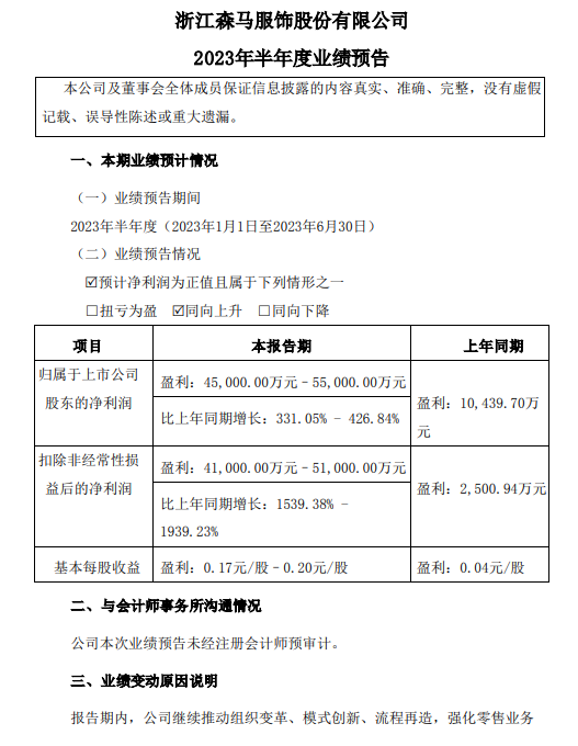 对于业绩变动的主要原因,森马服饰解释称,报告期内公司继续推动组织变革、模式创新、流程再造,强化零售业务组织能力,全面推进新零售模式落地实施,实现线上与线下、直营与加盟业务的相互赋能,促进了商品零售毛利率提升。同时,公司全面落实产品经理制,通过考核引导,聚焦产品质量、经营质效,期间费用率同比下降。