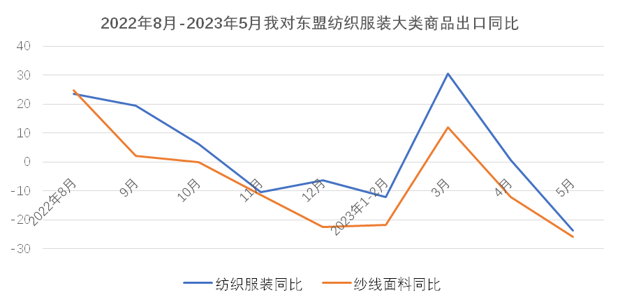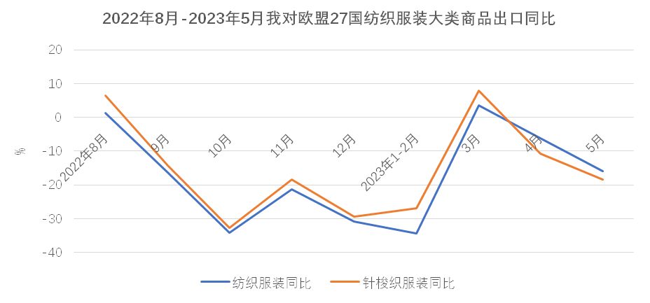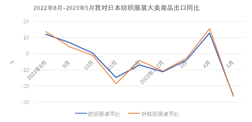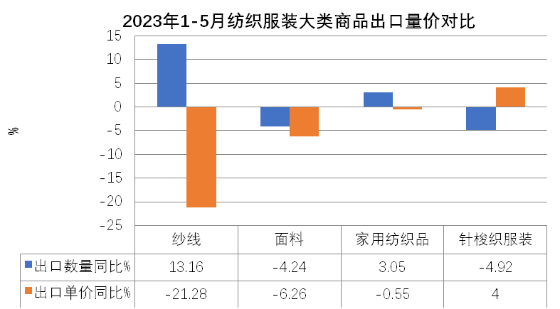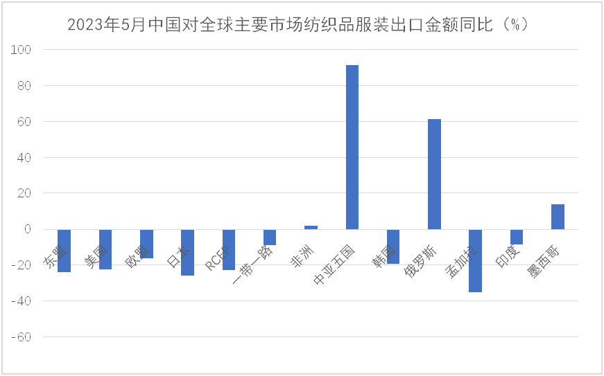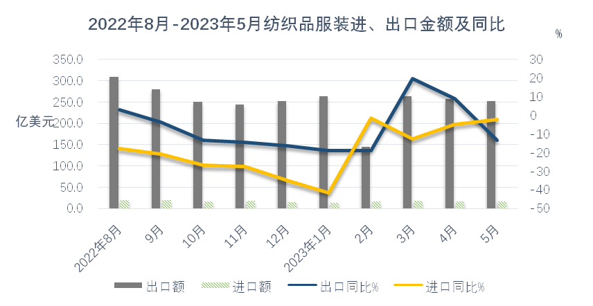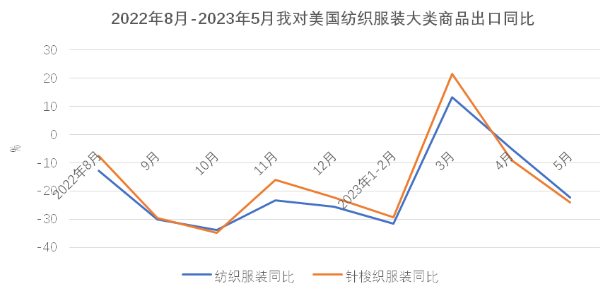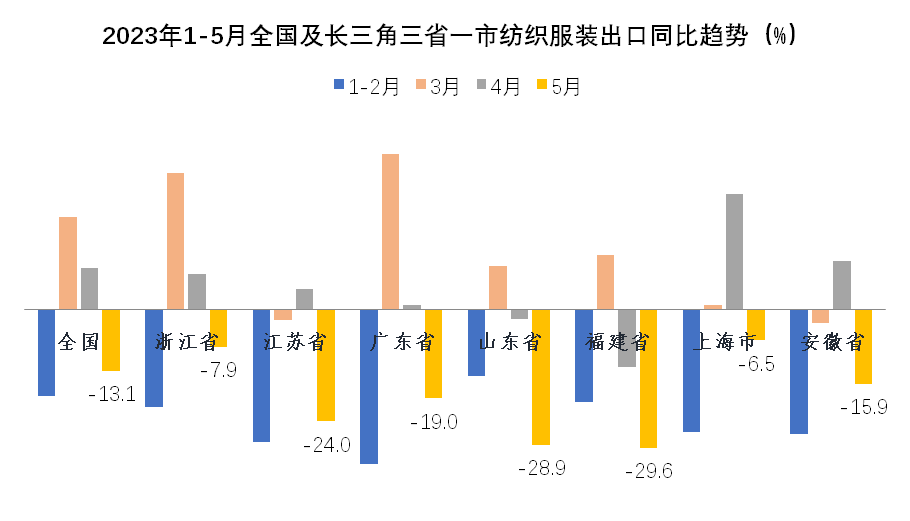 外需不足致5月出口再现“跳水”,俄罗斯与中亚成为出口亮点地区。3-4月纺织服装外贸出口经历了短暂好转,两月平均出口增长14.3%,但增长的根基不牢,在年初积压订单集中释放之后、外需并未有效恢复的情况下,5月纺织服装出口形势再次反转,当月出口又现两位数下降,降幅达13.1%。纺织服装出口当前正面临艰难的爬坡过坎阶段。从市场看,当月对四大重点市场东盟、美国、欧盟和日本的出口全部下降,且对前期表现尚可的东盟和日本的降幅超过美国和欧盟,说明全球大多数地区对服装类终端消费品的需求仍未恢复,发达国家市场去库存仍在进行时,连带中间品的需求同步下滑。在经历了10轮、累计500个基点的强劲加息后,美国5月核心CPI年率指数下降到5.3%,仍未及2021年底时的水平。6月在实际利率转正后,美联储暂停加息,但年内仍有两次25个基点的加息预期。欧洲央行6月再次加息,利率水平已经达到近20年来的最高点,但欧元区5月核心CPI为5.3%,仍处于较高水平,欧洲央行亦表示下半年仍会继续加息打击通胀。美欧重点市场恢复有待时日,目前初步预期下半年会有所回暖,但仍以谨慎乐观为主。与传统市场陷入下跌形成对比,俄罗斯与中亚成为纺织服装出口增长迅速的地区。5月,我对俄和中亚五国出口分别增长61.4%和91.5%,前五月累计分别增长45.9%和61%,二者合计对我整体出口形成了2.5个百分点的正向拉动。在我出口市场中所占比重升至7.4%。但该地区市场相对单一,体量有限,与美欧日市场所占份额仍差距较大,尚不能弥补传统市场下跌造成的损失。年初以来,纺织原料价格持续回落,5月纺织原料类购进价格指数降至95%,棉花和化纤的进口价格也分别降至2021年底和2022年初时的水平。在原料价格下降和外需不振的共同作用下,5月纺织服装出口量、价齐跌,出口量、价指数分别为-5.3%和-8.3%,其中大类商品的出口价格全部下跌,且跌幅超过年初时的水平。2023年1-5月,全国货物贸易进出口总值24412.3亿美元,同比(下同)下降2.8%,其中出口14003.5亿美元,增长0.3%,进口10408.8亿美元,下降6.7%,累计贸易顺差3594.7亿美元。2023年5月,全国货物贸易进出口总值5011.9亿美元,同比(下同)下降6.2%,其中出口2835.0亿美元,下降7.5%,进口2176.9亿美元,下降4.5%,贸易顺差658.1亿美元。1-5月,纺织品服装贸易额1264.3亿美元,同比下降5.9%,其中出口1182.1亿美元,下降5.3%,进口82.2亿美元,下降14.4%,累计贸易顺差1099.9亿美元,下降4.5%。5月,纺织品服装贸易额270.9亿美元,同比下降12.5%,其中出口253.2亿美元,下降13.1%,进口17.7亿美元,下降2.4%,当月贸易顺差235.5亿美元,下降13.9%。由于年初积压的订单在3月、4月基本完成出货,在国际需求收缩持续、订单下滑、去年同期高基数的压力下,5月出口同比未能延续前两个月的上涨势头,重回去年7月以来的跌势,同比下降13.1%,环比则连续第二个月下降,较上月下降1.3个百分点。6月出口走向尚不明朗,继续下滑的可能性较高。二、市场结构变化仍在继续,一带一路沿线国家和非洲等非传统市场成为出口重要推动力传统发达市场需求走弱、库存消化缓慢仍是当前我国纺织服装出口面临的主要困难。在3月、4月消化完年初积压订单后,5月我对欧美日等传统市场出口再次出现较大幅度下滑,拖累我纺织服装整体出口。5月单月,我对美国、欧盟27国和日本出口同比分别下降22.2%、15.9%和25.5%,均超13.1%的整体降幅。欧美在我出口市场中所占份额也从去年的31%降至今年前五月的27.4%,下降了3.6个百分点。同时,欧美需求不振也导致我中间品对东盟出口增长动能不足。5月,我对东盟出口同比下降23.7%。与上述四大市场形成鲜明对比的是,5月我对中亚五国、非洲国家、俄罗斯和墨西哥出口保持增长,涨幅分别达91.5%、2.1%、61.4%和14%。值得一提的是,1-5月我对非洲国家累计出口105.1亿美元,同比上涨13.3%,非洲国家占我出口市场的份额提升至8.9%,1-5月我对加纳、塞内加尔、阿尔及利亚、安哥拉等国的出口增幅超过40%,在有海关统计的50多个非洲国家中,我对逾40个非洲国家出口保持了增长,非洲国家成为我纺织服装出口的重要增长点。东盟—受欧美需求下降的传导影响,我对东盟出口增长动能减弱。5月我对东盟出口同比大幅下降23.7%,环比下降13.5%。其中中间品纱线面料下降25.9%。1-5月累计对东盟出口下降3.9%,其中纱线面料合计出口下降14.1%,服装出口增长18.9%。美国—对美出口继续下跌。5月对美出口延续跌势,且跌幅有所扩大,从上月的5%扩大到本月的22.2%。重点商品针梭织服装当月出口量价齐跌,金额同比降幅由上月的9%扩大至24%,其中出口量同比下降21%,出口均价微降3.7%。1-5月我对美累计出口179.5亿美元,下降16.7%,其中针梭织服装合计出口下降16.2%,主要是出口量下降21.4%,出口均价保持6.6%的上涨。欧盟—对欧盟出口延续跌势,5月同比降幅由上月的6.2%扩大至15.9%。但在四大重点市场中,本月欧盟降幅最低。其中大类商品针梭织服装出口下降18.5%。与美国略有不同的是,对欧盟针梭织服装出口额下降更多地是由于价格下降所致,当月出口价格下跌11.1%,出口数量下降8.3%。1-5月对欧盟累计出口144.2亿美元,下降19.3%。大类商品针梭织服装合计下降20%,出口量和均价分别下跌12%和9.1%。日本—在4月实现去年11月以来唯一的月度增长之后,5月我对日出口重回跌势,当月出口同比下降25.5%,在四大重点市场中跌幅最大。其中大类商品针