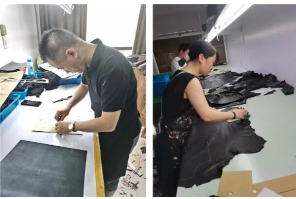 ▲挑选原料,左一为欧龙公司总经理王国良“我用三台缝纫机,在自己的家里办起一家皮件生产加工厂,一边组织人员生产,一边在老皮革城门市经营皮衣,”欧龙皮革服饰公司总经理王国良笑着说。如今,他在创业路上走过了26个年头,当年的毛头小伙子变成中年大叔,初心不变。
