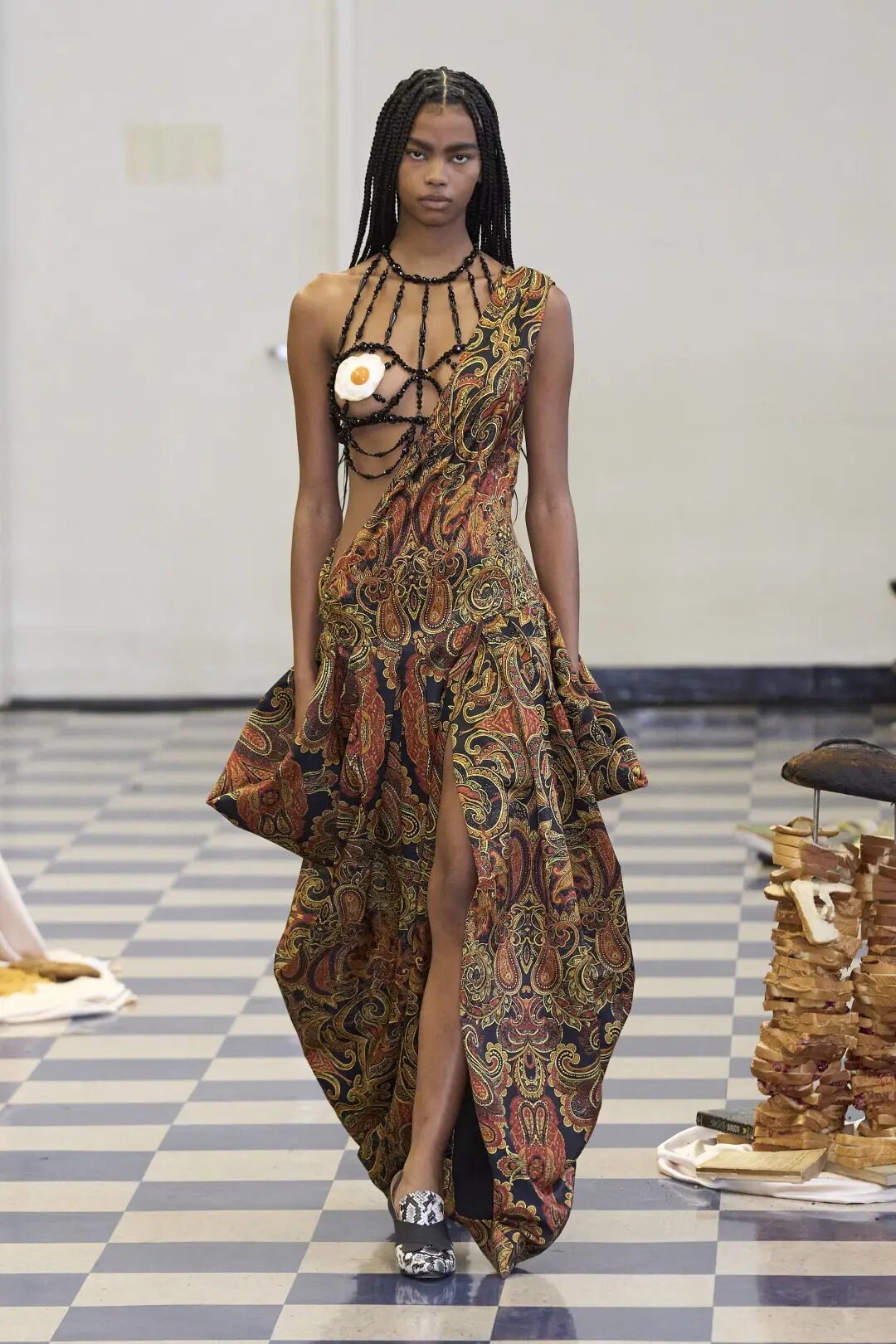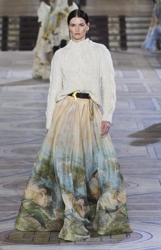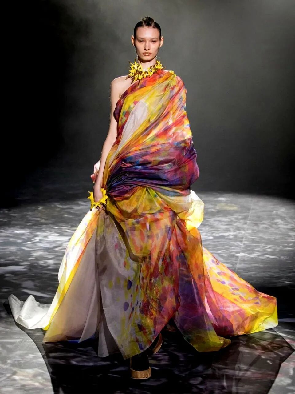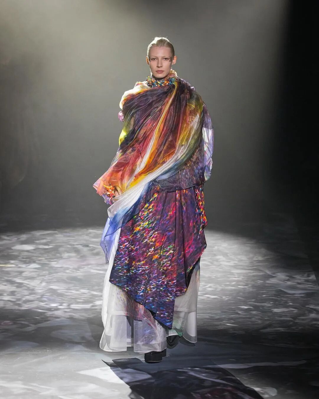 雾蒙蒙的褪色效果反映了多重危机时代的暗黑基调。设计师纷纷借助AI创造力以打造超现实主义风格。虚幻的褪色图案和模糊印花极具跨季魅力,呼应着无尽幻想预测主题。