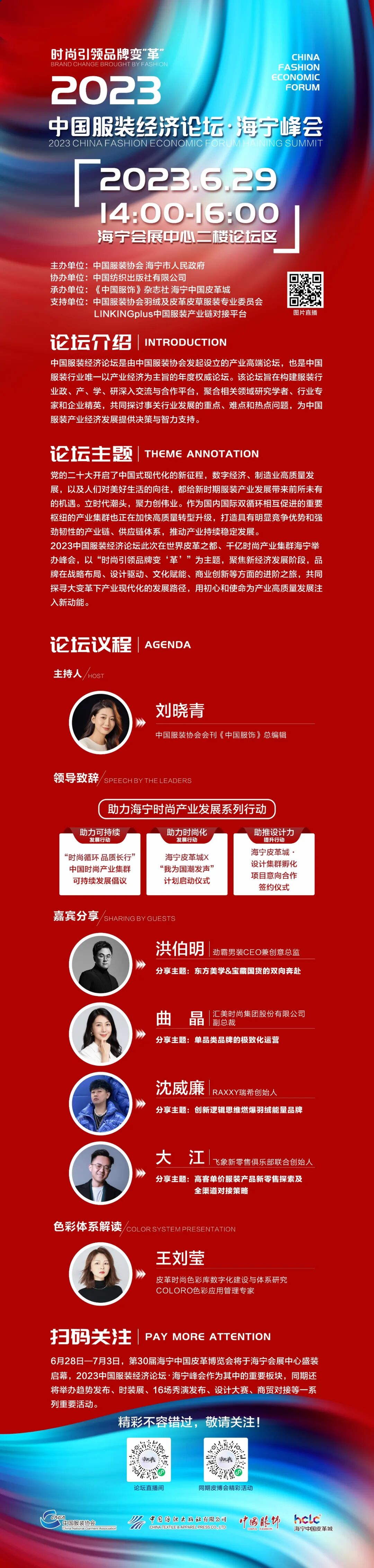 2023中国服装经济论坛是由中国服装协会发起、设立的产业高端论坛,也是中国服装行业唯一以产业经济为主旨的年度权威论坛。时尚产业是浙江海宁的主导产业、富民产业,是海宁产业高质量发展的“金字招牌”。此次在第30届海宁中国皮革博览会期间落地海宁峰会,对于当前经济下推动海宁当地产业集群发展以及推动中国服装行业发展有着深远意义。