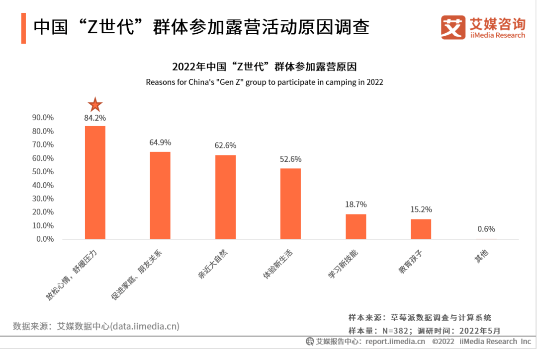 调研数据显示,中国“Z世代”群体参加露营的主要目的为放松心情,缓解压力,占比84.2%;为促进家庭、朋友关系和亲近大自然,分别占比64.9%和62.6%。此外,中国“Z世代”群体参加露营还为了体验新生活和学习新技能等需求,分别占比52.6%和18.7%。