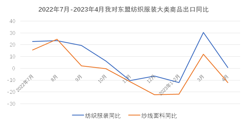 东盟—受欧美需求下降的传导影响,我对东盟出口增长动能减弱。4月我对东盟出口保持增长,但增幅仅有0.7%,较上月回落近30个百分点。其中中间品纱线面料下降12.1%,增长后续动力不足。1-4月累计对东盟出口增长2.3%,其中纱线面料合计出口下降10.5%,服装出口增长31%。