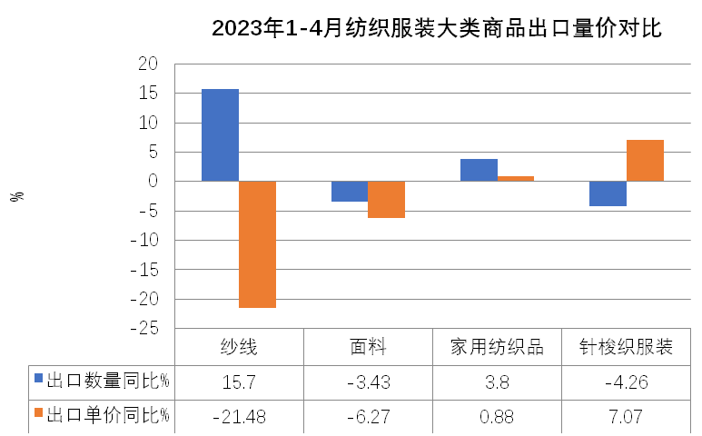 1-4月,纺织品累计出口下降8%,服装恢复2.5%的增长,其中四大类商品中,纱线和面料出口分别下降9.1%和9.5%,家用纺织品和针梭织服装均止跌反弹,分别增长4.7%和2.5%。出口量价看,纱线的出口量保持较快增长,家纺和针梭织服装的出口价格开始回升。