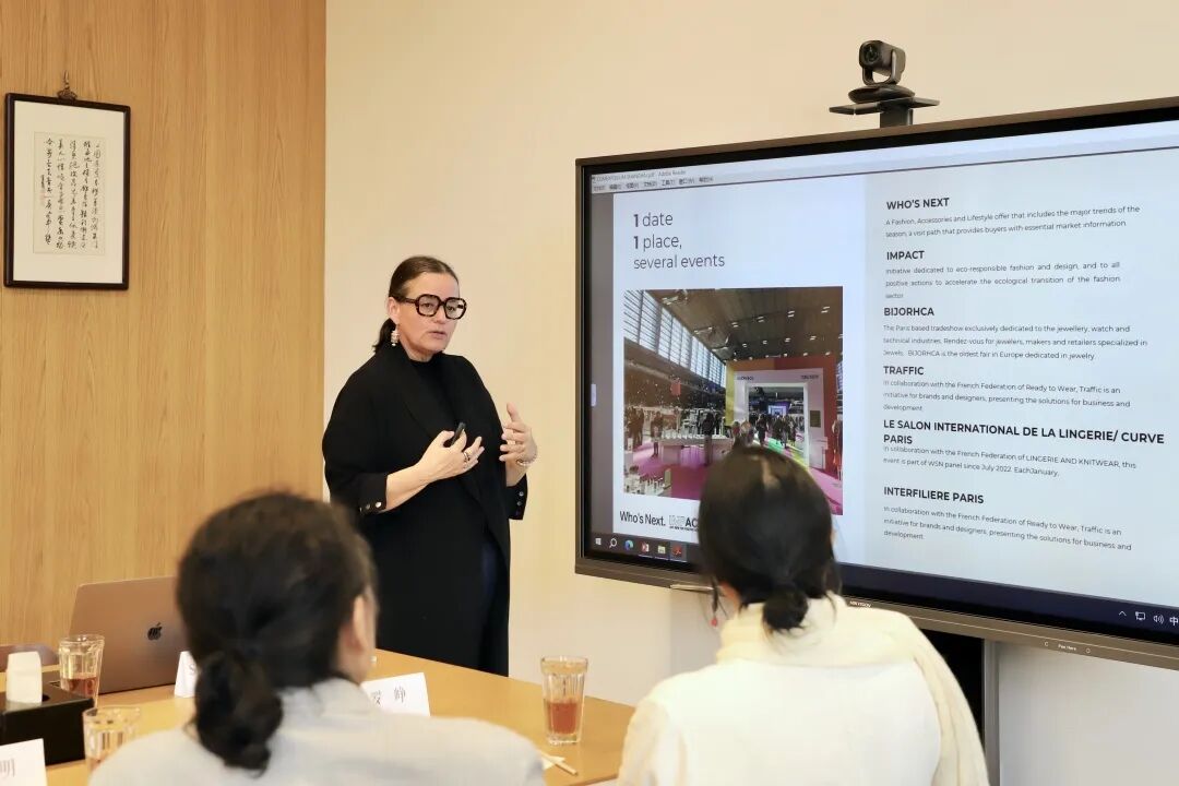 在随后的交流会上,法国who's next 展时尚总监Sylvie Pourrat就本次展会及法国市场做了分享。中国十佳时装设计师、宝鼎设计设计总监王飞为大家带来AI在服装设计研发应用情况的分享。各品牌进行了面对面的深入友好交流,分析当前女装领域发展面临的困难和机遇,共同探讨女装领域乃至民族时尚品牌的未来发展之路。