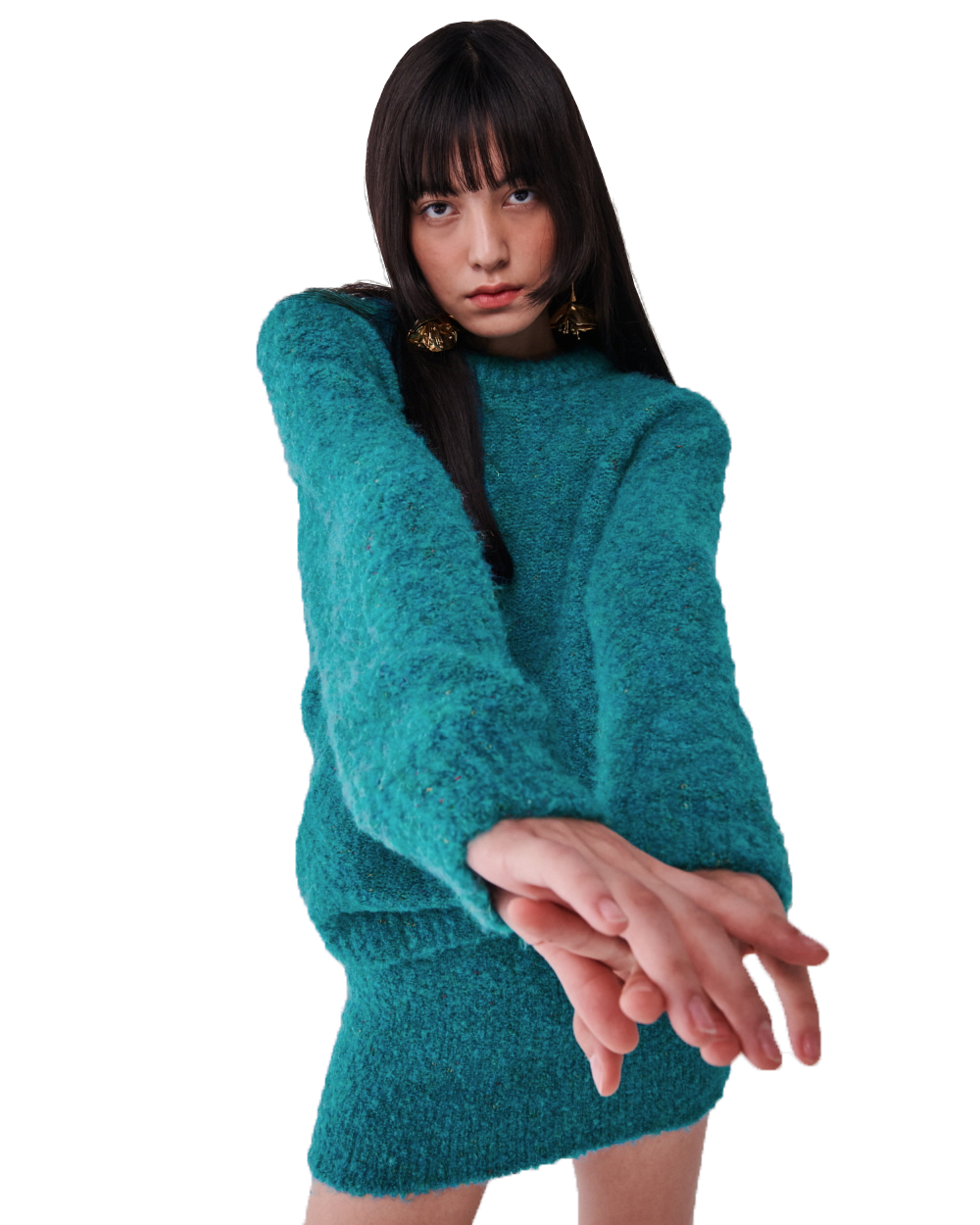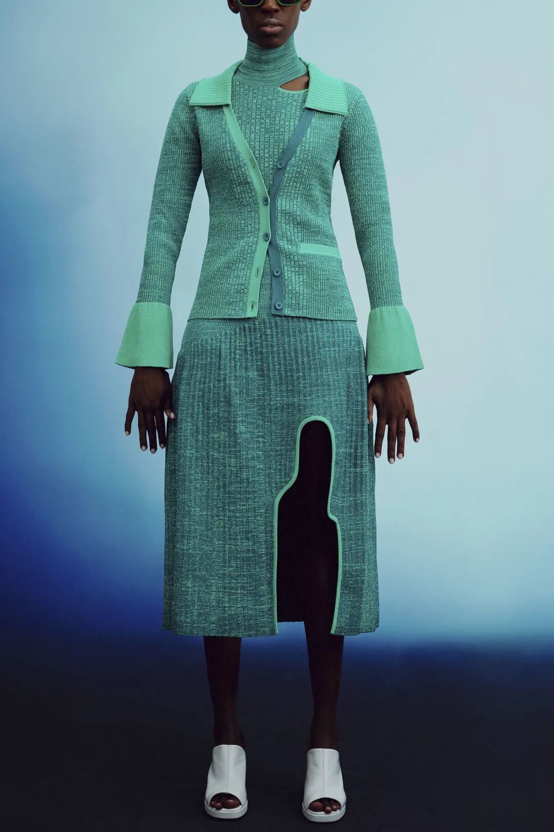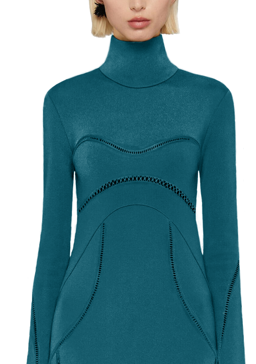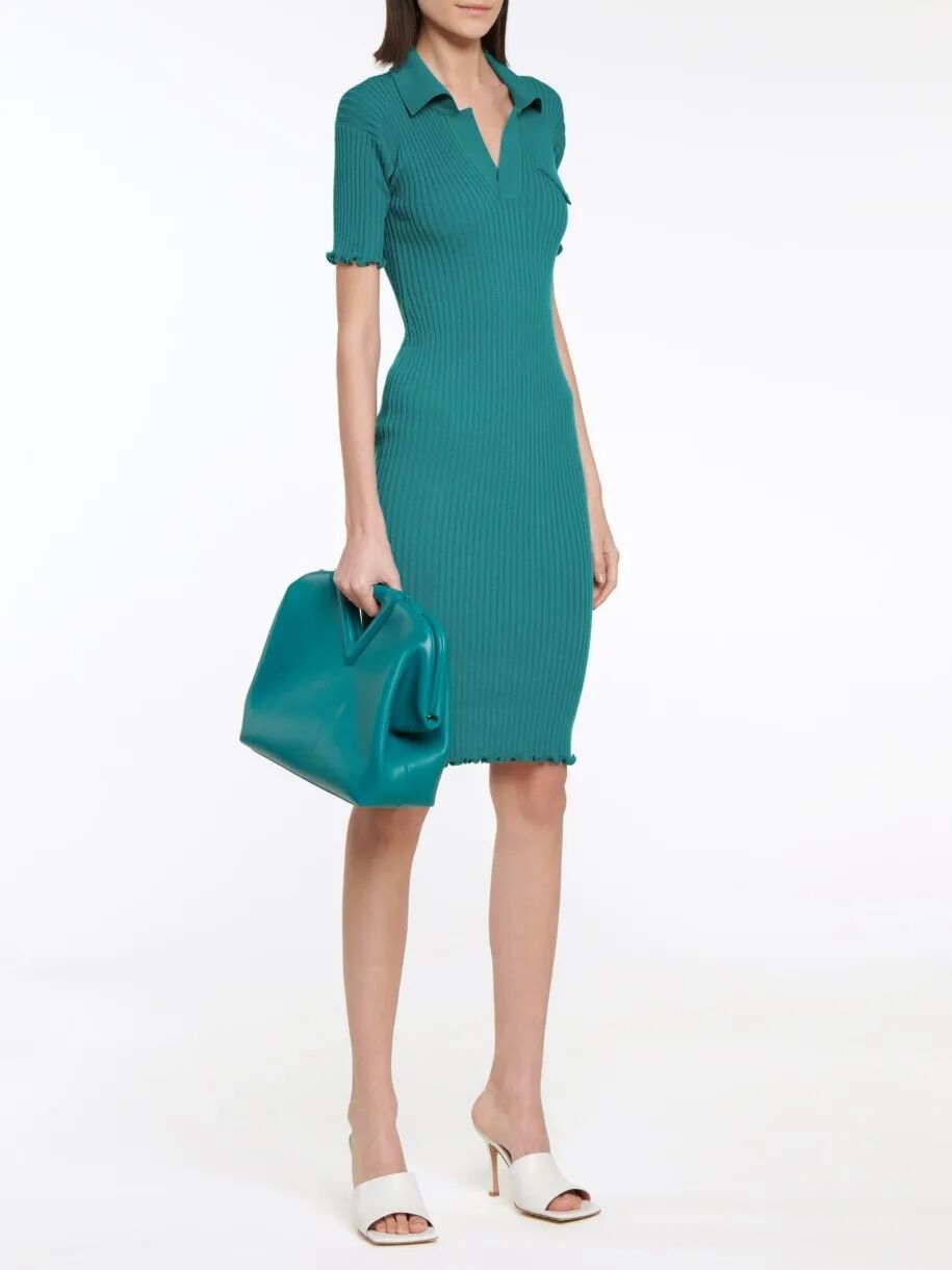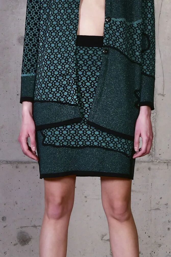 青礁绿是来源于大自然的颜色,具有较高的饱和度,运用在服装上可以给都市生活带来新的生机。作为在24春夏季颇具吸引力的色彩,青礁绿以精致造型展示其色彩魅力。下面小编就将以三大热门针织单品带你探索属于青绿礁的自然魅力~青礁绿的色彩气质非常适合运用在连衣裙的设计中来打造复古的精致美,可以非常好地诠释理性又浪漫的复古典雅气质。在青绿礁连衣裙的设计上可以重点关注坑条、移针、嵌花等针织组织带来的不同的质感表达。同色系菱形格,撞色、纯色抽条的设计在青礁绿的加持下展示出独特的魅力,复古氛围感油然而生。在做撞色设计时可以考虑同色系的搭配,或者小部位的点缀。青礁绿色彩在套衫中的运用也有很多的可能性,粗针撞色、立体肌理感、宽松的廓形都给予了青礁绿更多的设计思路。“碳循自然之美”中国服装绿色宣言暨零碳时尚发布正式启动