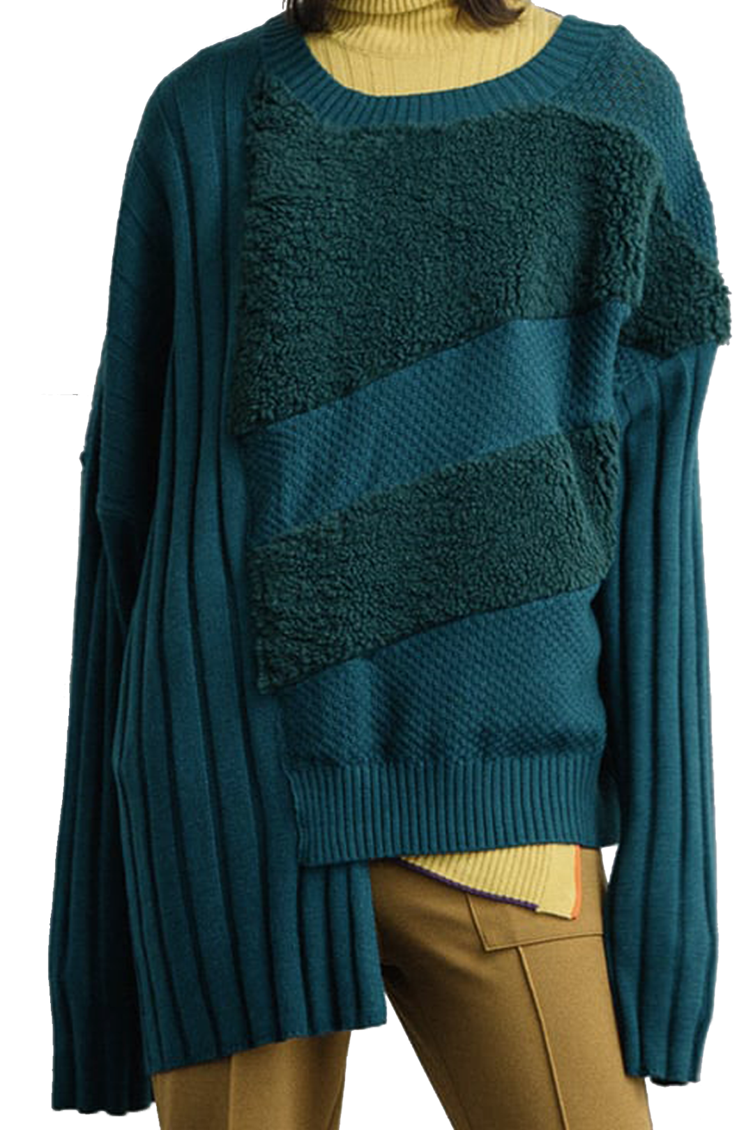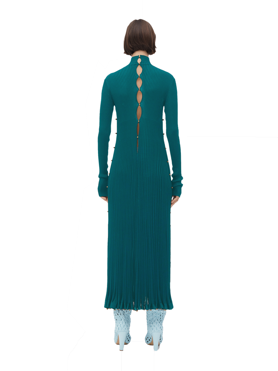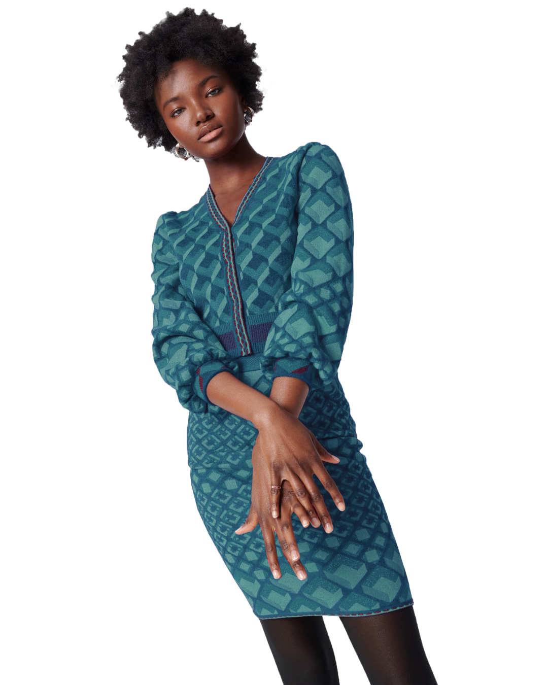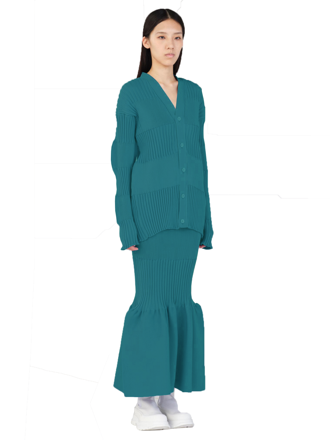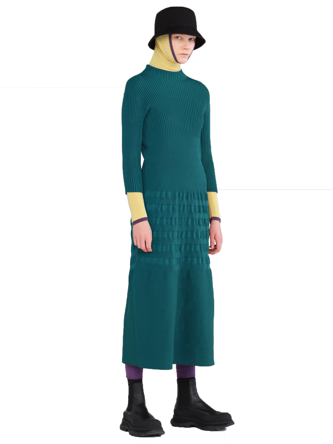青礁绿是来源于大自然的颜色,具有较高的饱和度,运用在服装上可以给都市生活带来新的生机。作为在24春夏季颇具吸引力的色彩,青礁绿以精致造型展示其色彩魅力。下面小编就将以三大热门针织单品带你探索属于青绿礁的自然魅力~青礁绿的色彩气质非常适合运用在连衣裙的设计中来打造复古的精致美,可以非常好地诠释理性又浪漫的复古典雅气质。在青绿礁连衣裙的设计上可以重点关注坑条、移针、嵌花等针织组织带来的不同的质感表达。同色系菱形格,撞色、纯色抽条的设计在青礁绿的加持下展示出独特的魅力,复古氛围感油然而生。在做撞色设计时可以考虑同色系的搭配,或者小部位的点缀。青礁绿色彩在套衫中的运用也有很多的可能性,粗针撞色、立体肌理感、宽松的廓形都给予了青礁绿更多的设计思路。“碳循自然之美”中国服装绿色宣言暨零碳时尚发布正式启动
