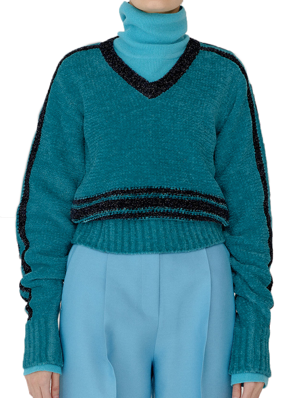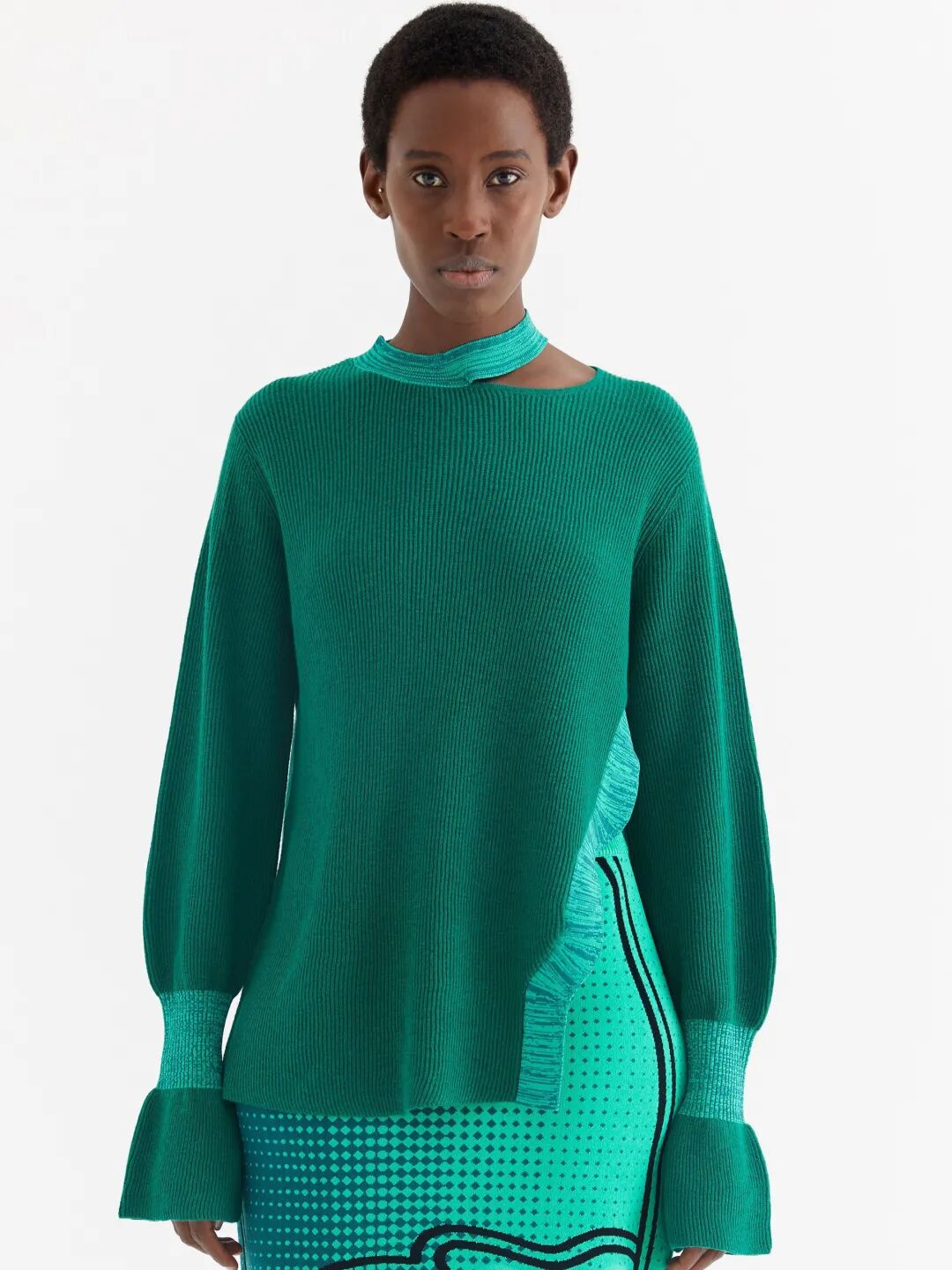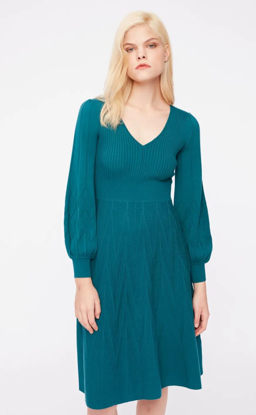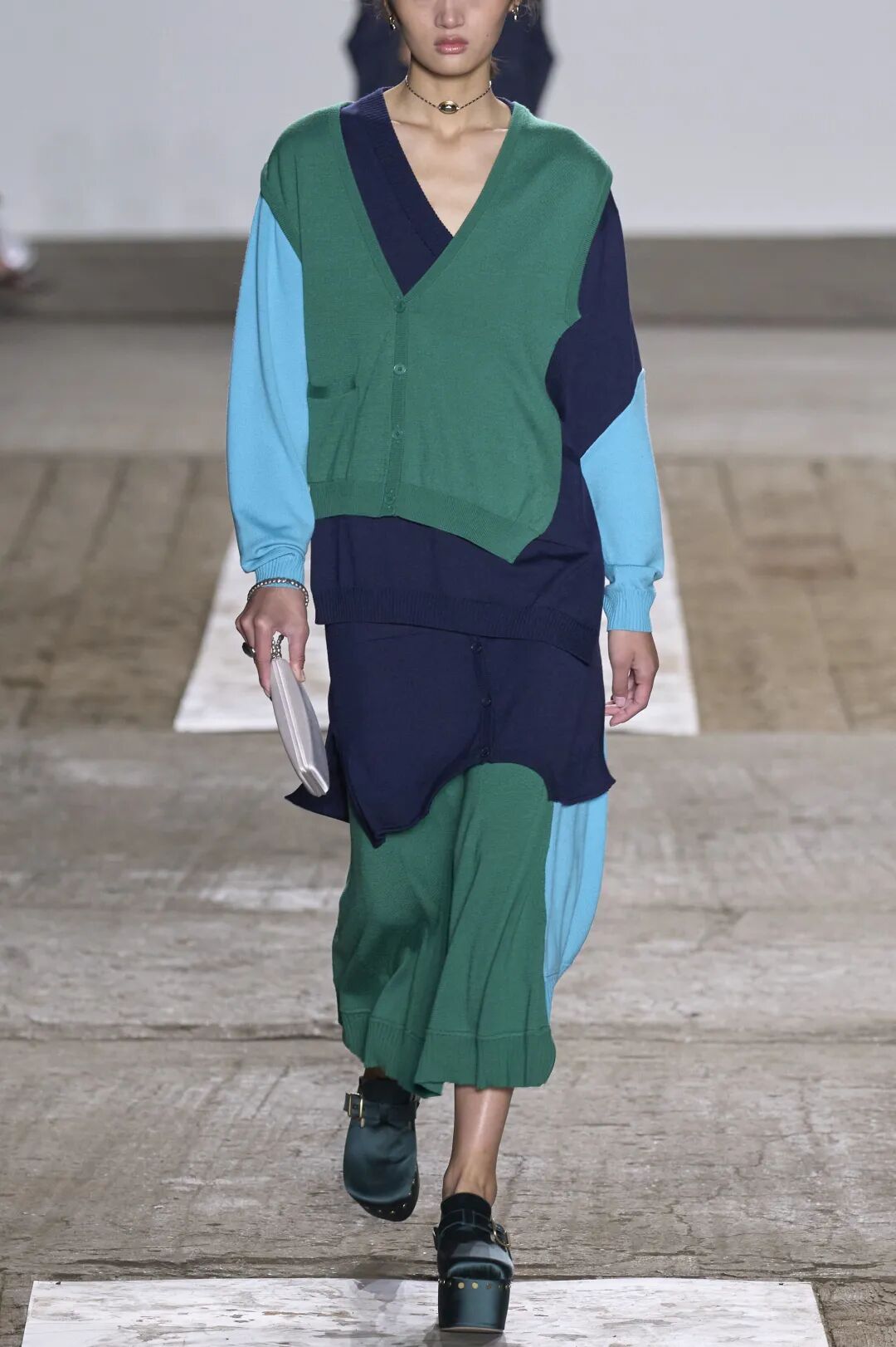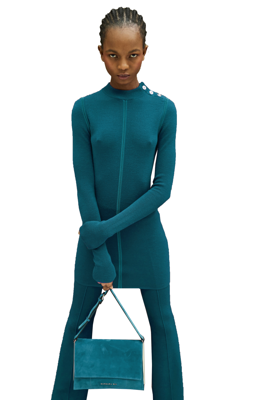 青礁绿是来源于大自然的颜色,具有较高的饱和度,运用在服装上可以给都市生活带来新的生机。作为在24春夏季颇具吸引力的色彩,青礁绿以精致造型展示其色彩魅力。下面小编就将以三大热门针织单品带你探索属于青绿礁的自然魅力~青礁绿的色彩气质非常适合运用在连衣裙的设计中来打造复古的精致美,可以非常好地诠释理性又浪漫的复古典雅气质。在青绿礁连衣裙的设计上可以重点关注坑条、移针、嵌花等针织组织带来的不同的质感表达。同色系菱形格,撞色、纯色抽条的设计在青礁绿的加持下展示出独特的魅力,复古氛围感油然而生。在做撞色设计时可以考虑同色系的搭配,或者小部位的点缀。青礁绿色彩在套衫中的运用也有很多的可能性,粗针撞色、立体肌理感、宽松的廓形都给予了青礁绿更多的设计思路。“碳循自然之美”中国服装绿色宣言暨零碳时尚发布正式启动