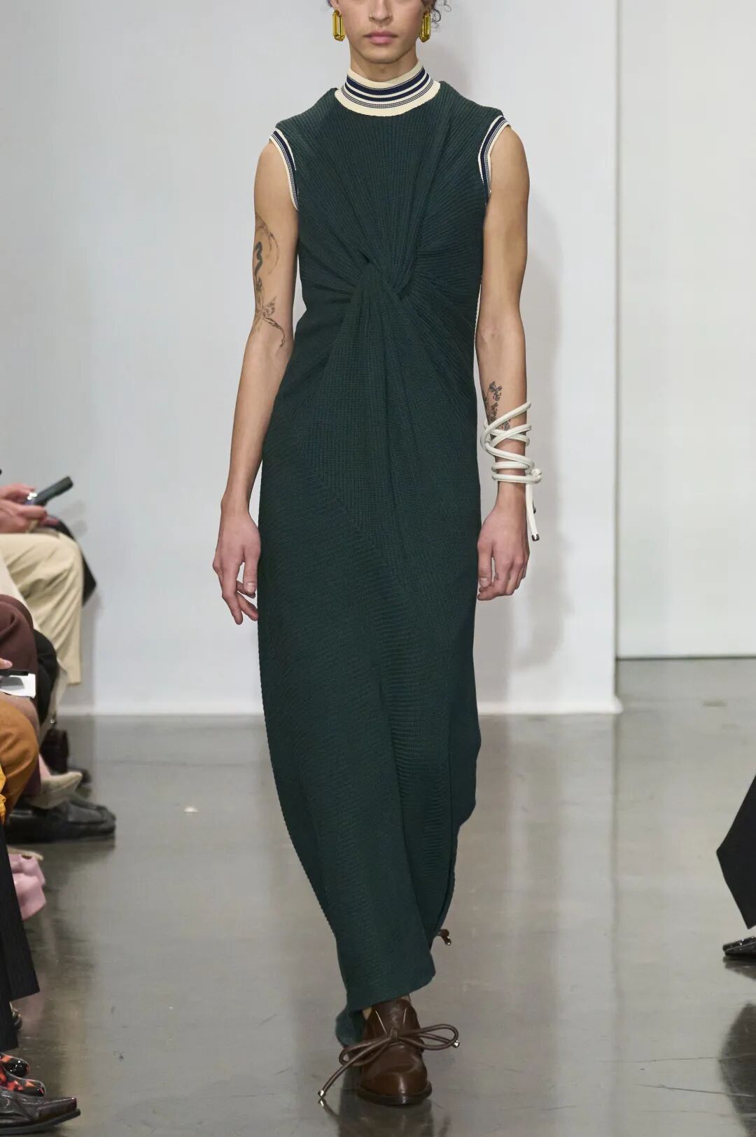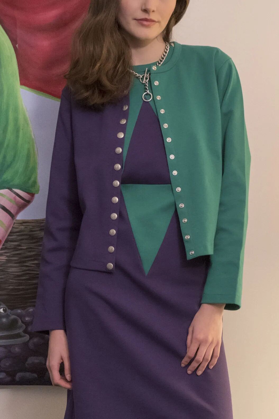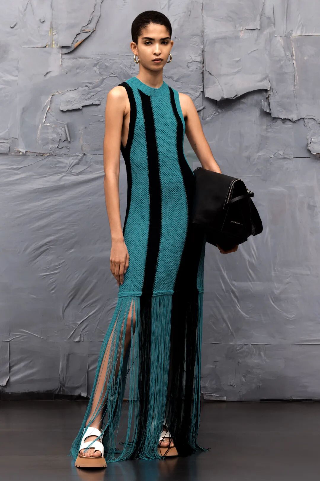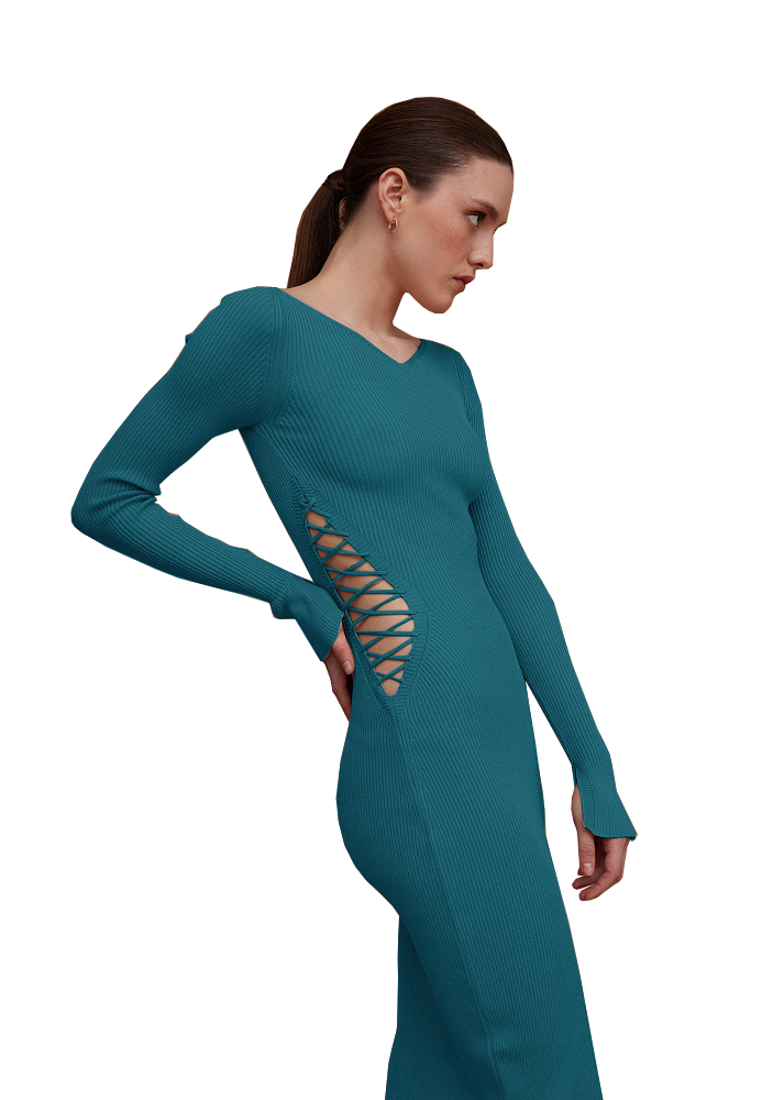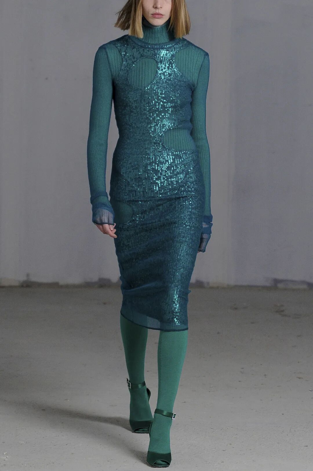 青礁绿是来源于大自然的颜色,具有较高的饱和度,运用在服装上可以给都市生活带来新的生机。作为在24春夏季颇具吸引力的色彩,青礁绿以精致造型展示其色彩魅力。下面小编就将以三大热门针织单品带你探索属于青绿礁的自然魅力~青礁绿的色彩气质非常适合运用在连衣裙的设计中来打造复古的精致美,可以非常好地诠释理性又浪漫的复古典雅气质。在青绿礁连衣裙的设计上可以重点关注坑条、移针、嵌花等针织组织带来的不同的质感表达。同色系菱形格,撞色、纯色抽条的设计在青礁绿的加持下展示出独特的魅力,复古氛围感油然而生。在做撞色设计时可以考虑同色系的搭配,或者小部位的点缀。青礁绿色彩在套衫中的运用也有很多的可能性,粗针撞色、立体肌理感、宽松的廓形都给予了青礁绿更多的设计思路。“碳循自然之美”中国服装绿色宣言暨零碳时尚发布正式启动