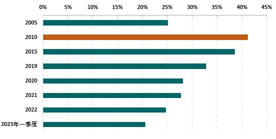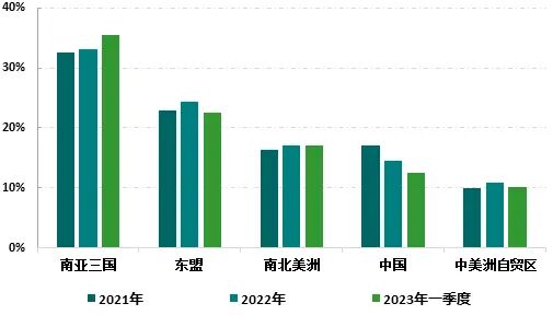 国际供应链格局调整重构,美国自我国直接进口比重下降 近年来,我国在美国纺织品服装进口中的占比呈现持续下降走势。美国商务部相关统计数据显示,我国纺织品服装在美国进口额中的占比峰值出现在2010年,当年占比为41.2%,此后逐年回落,2023年一季度已降至20.6%,其中棉制纺织服装产品占比从2010年35.4%下降至12.6%。引发我国纺织服装产品在美国市场份额下降的部分原因是,近年来国际纺织产业链、供应链格局发生重要改变,东南亚、南亚等发展中国家依托要素成本优势和发达国家给予的关税优惠,积极承接纺织服装产业转移,特别是服装加工能力实现较快增长。随着中美经贸合作关系日趋复杂,国际采购商不断降低在我国的采购订单比重,美国推出所谓涉疆“法案”后,棉制产品采购订单从我国流出的趋势更为明显。我国纺织企业出于规避贸易风险和提升国际化布局效率考虑,也参与到了国际产业链、供应链调整进程当中,在越南、柬埔寨、缅甸等东南亚国家投建了生产加工基地,将部分出口订单转移至海外工厂完成。从2010年到2022年,越南、印度、孟加拉在美国纺织品服装进口额中的合计占比从16.9%提高到30.8%;印度、孟加拉在棉制纺织服装产品进口额中占比2023年一季度已合计高达27.8%。