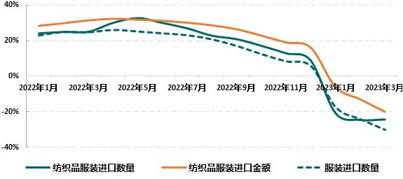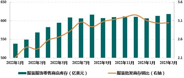 受需求疲弱影响,美国服装产品库存压力自2022年二季度开始显现,并一路走高。服装服饰零售商店库存于6月突破600亿美元,同比增速高达32%,服装批发商12月存销比高达3.26,为1992年有该项数据统计以来的高位,仅低于2020年4~5月新冠疫情爆发初期4~6的存销比水平。2023年以来,品牌商普遍放缓采购节奏积极去库存,但库存整体仍呈逐月增加态势。3月美国服装服饰商店零售库存达618.3亿美元,同比增长8.8%,环比增长0.8%,服装批发商存销比高于上年同期30%。美国Inventory Planner最近调查显示,一季度后仍有近半数时装店库存过剩。在需求低迷、库存高位的情况下,美国进口纺织品服装的金额及数量均明显放缓,2023年一季度,美国从全球进口纺织品服装总金额同比减少20%,进口数量同比减少24.3%,其中服装进口数量大幅减少30.1%。图4:美国服装产品零售及批发库存情况