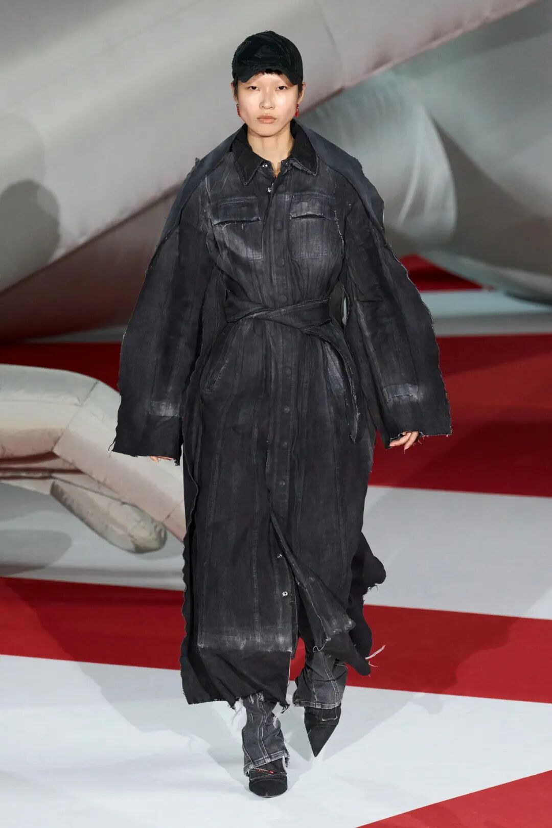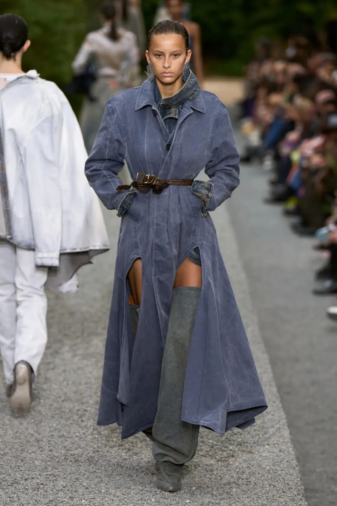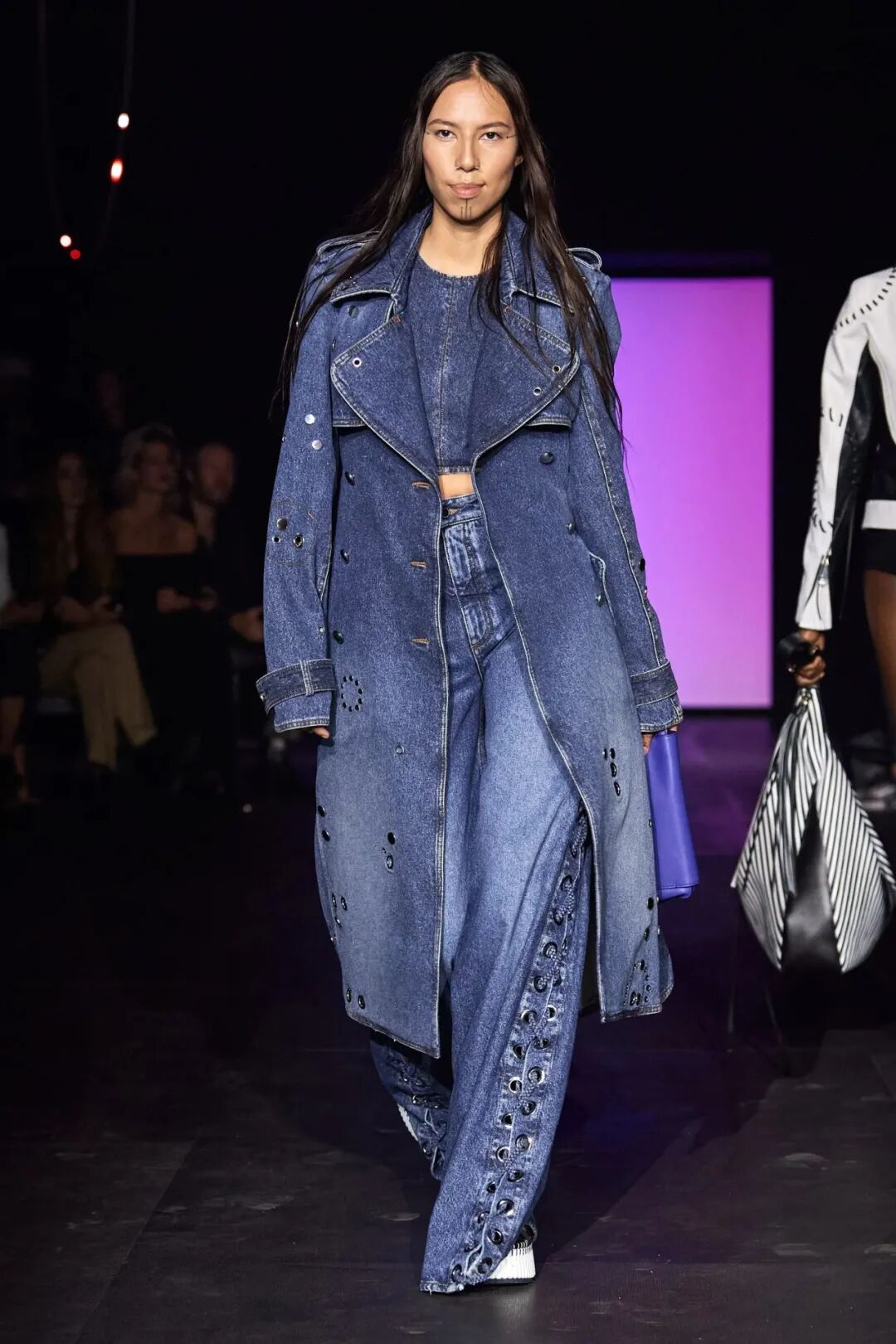 毕竟,春季走秀已经预料到将面临年度赌注之一。例如,在 Chloé,模特和原住民活动家Quannah Chasinghorse走秀时穿着牛仔布整体造型,包括露脐上衣和带孔眼和蕾丝的宽松牛仔裤,搭配一件让人想起经典风衣廓形的大衣,宽翻领。Y/Project 和 Diesel 将牛仔布作为其风格的标志,在 2023 年春夏推出的牛仔风衣分别采用带有大镂空和协调靴子的褪色蓝色,以及带毛边的黑色阴影。