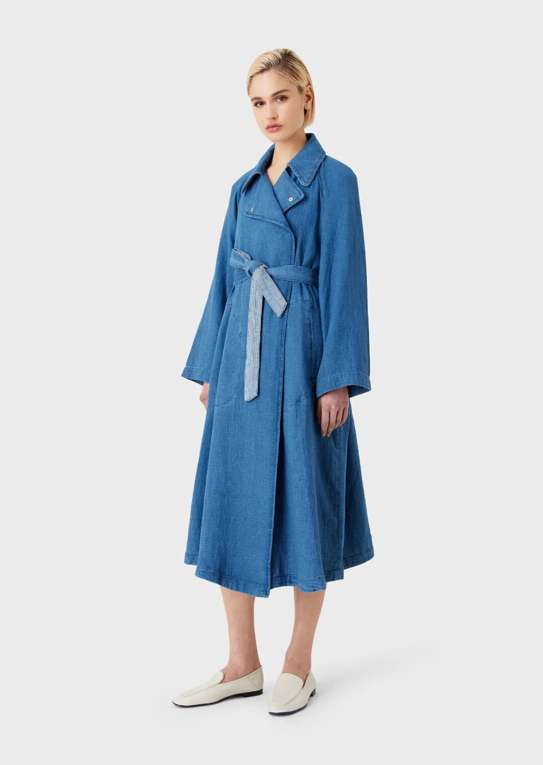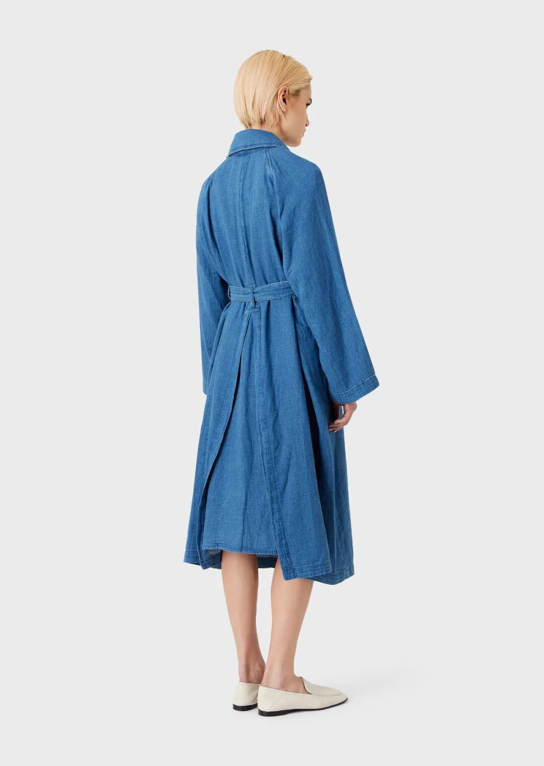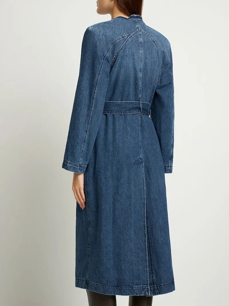 乔治·阿玛尼 (Giorgio Armani) 与 10 Corso Como 的全新合作设计了一款柔软的棉质牛仔风衣:单排扣款式,采用阳刚剪裁,肩部设计,宽缺口翻领,腰部系腰带,背面开衩,缀饰与皮革轮廓皮革颜色。