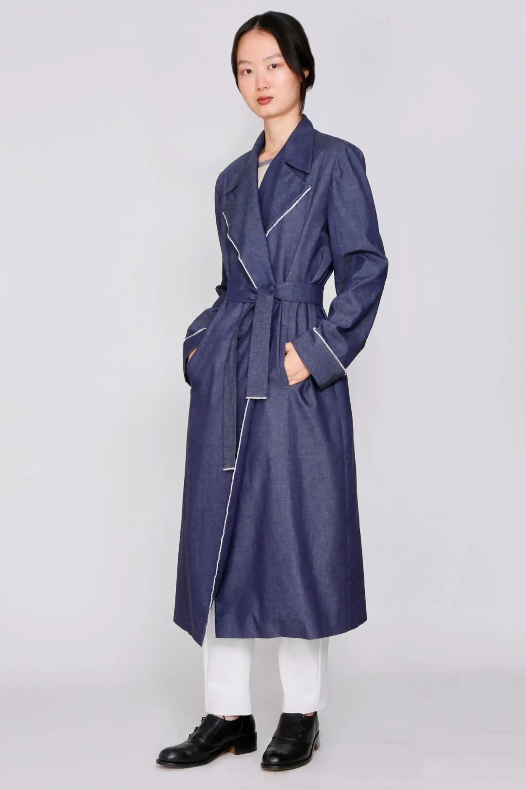 Yeohlee 是来自马来西亚的美国设计师 Yeohlee Teng 的品牌,提供更精致、更轻盈的版本,蓝色配白色饰边,搭配直筒牛仔裤和阳刚系带鞋。拼接这一今年在每件衣服上无处不在的工艺,也被愉快地应用到牛仔风衣上:例如,Marc Jacobs 将不同深浅的蓝色、黑色和金属银色组合成精致的几何设计。Tod's还推出了拼接牛仔布风衣,但版本更为精致:浅色牛仔裤的两个垂直部分通过对比鲜明的毛边缝线连接,搭配协调的裤装。