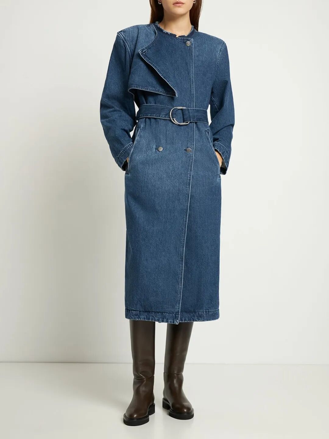最新版本由 Giorgio Armani 签名,这是与 10 Corso Como 合作的胶囊系列中的一件:浅色深色牛仔风衣,带有对比色皮革细节。