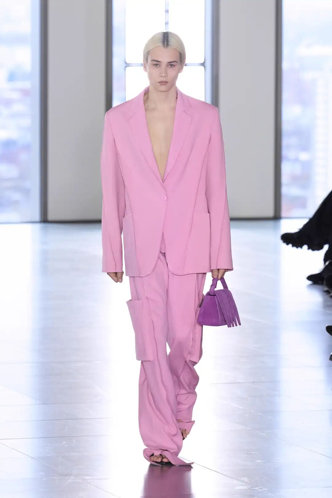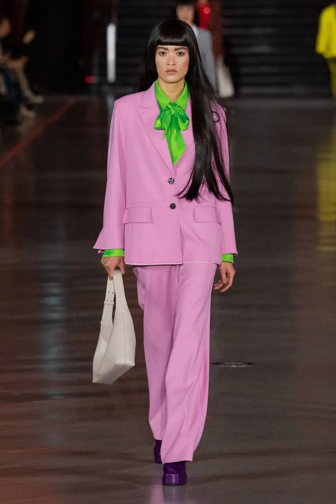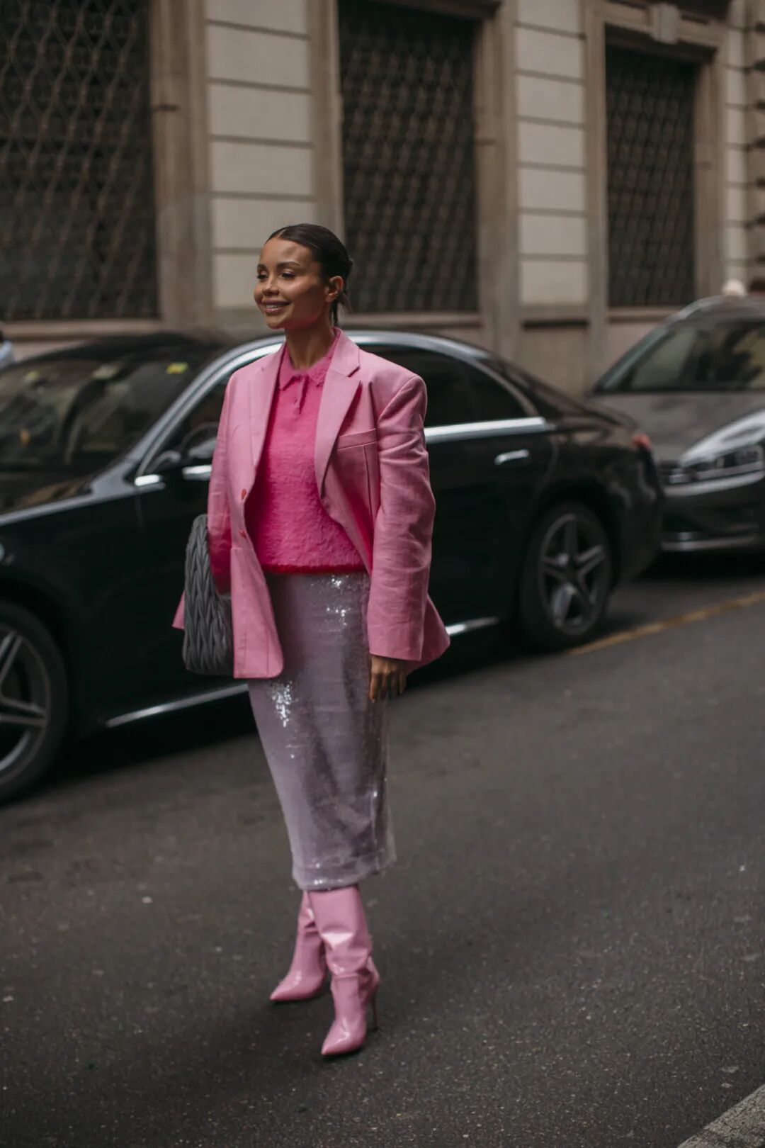 翻糖粉凭借其性别包容属性,已成为年轻品类的关键趋势,预计该色调将通过连衣裙和西装,以更大的规模进入高端市场。极具视觉冲击力的全身造型将扩大营销影响力。