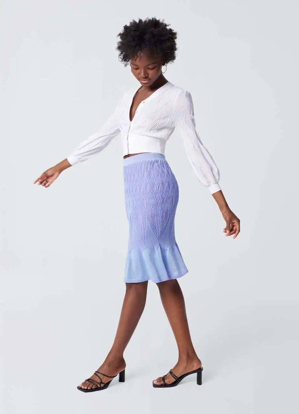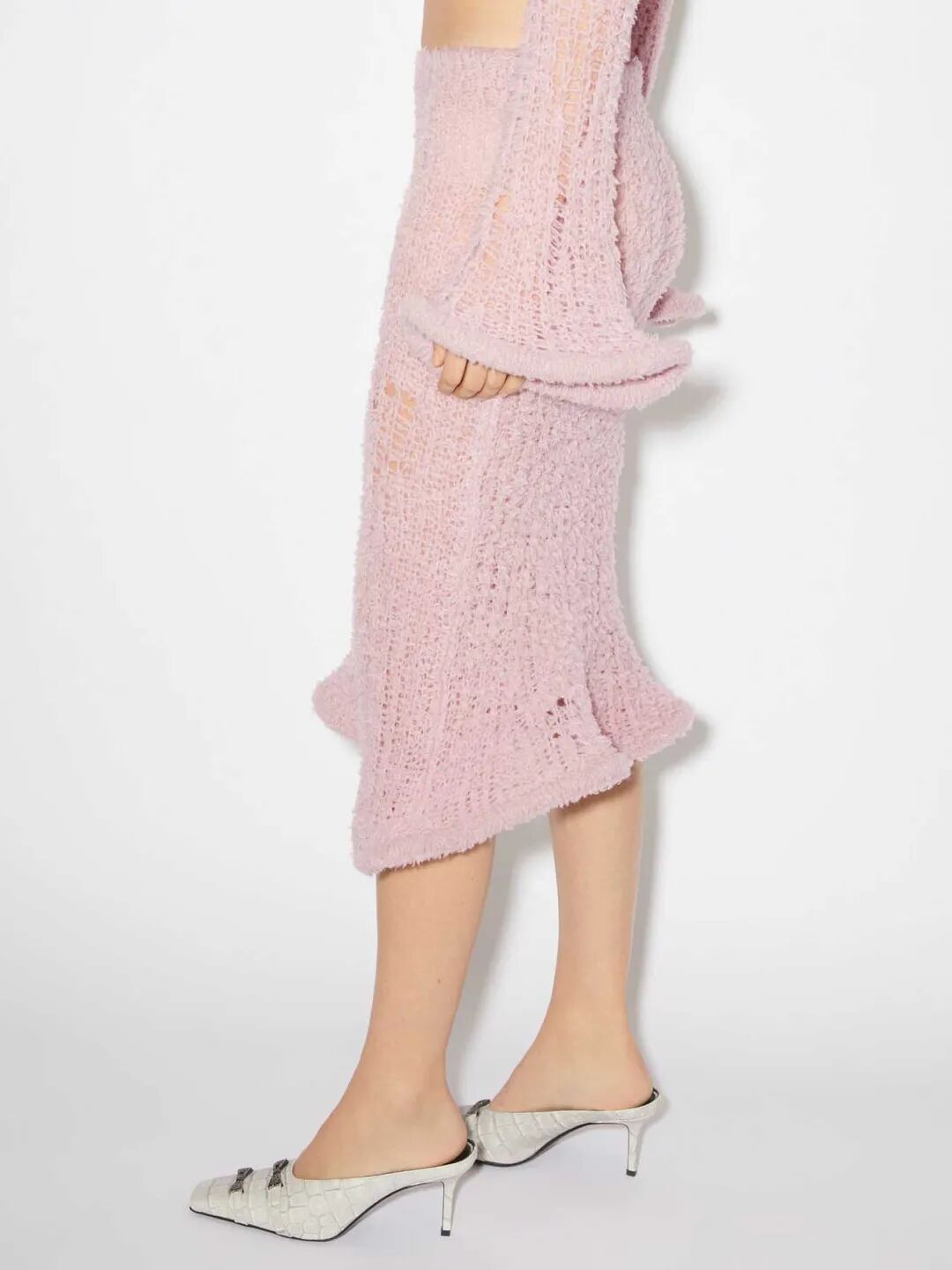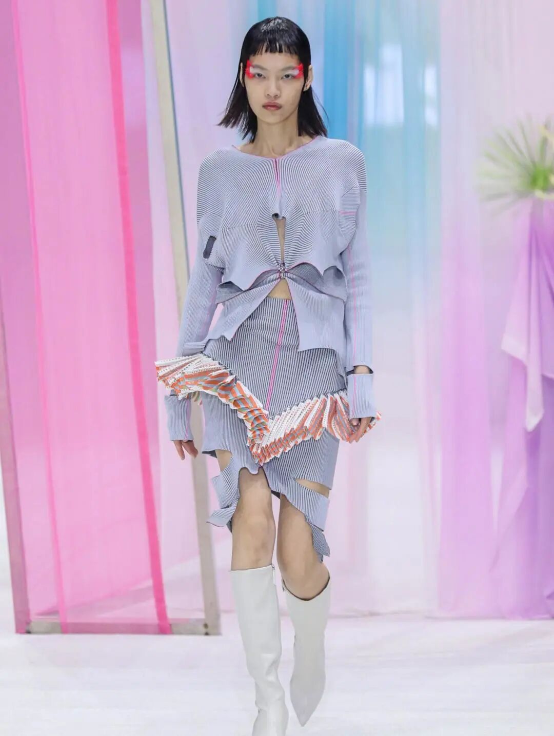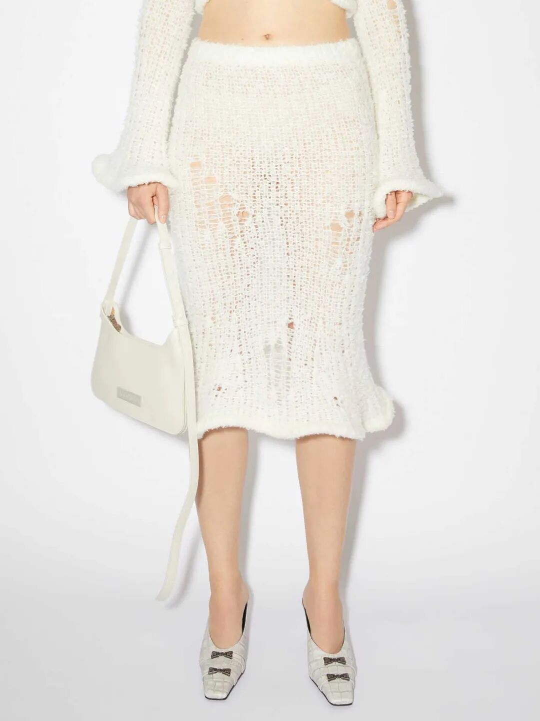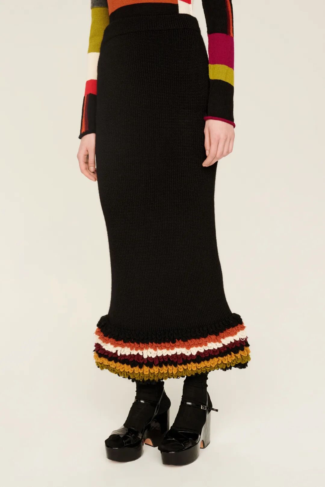 新季的针织半裙更加注重对下摆的不规则造型设计,如方形垂坠下摆、不规则切割、波浪形下摆等,非常规形式的编织与裁剪使得针织半裙这一常见单品更加个性、时尚。