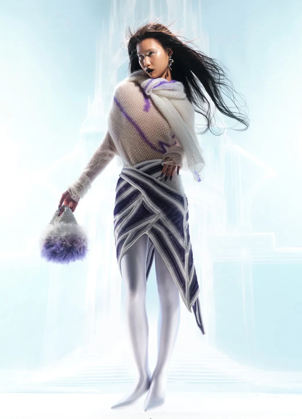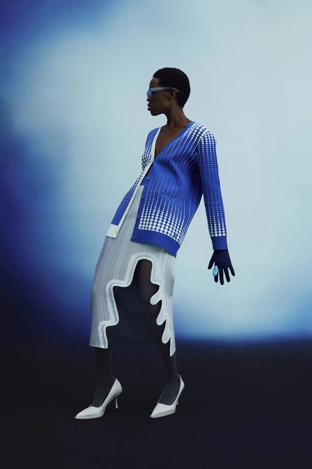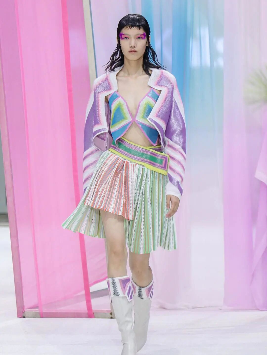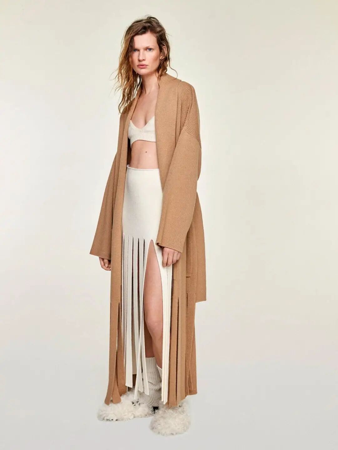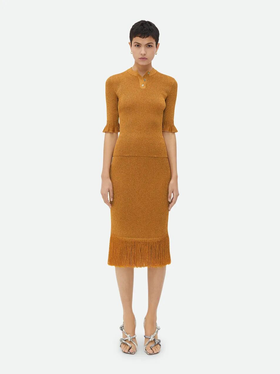 新季的针织半裙更加注重对下摆的不规则造型设计,如方形垂坠下摆、不规则切割、波浪形下摆等,非常规形式的编织与裁剪使得针织半裙这一常见单品更加个性、时尚。