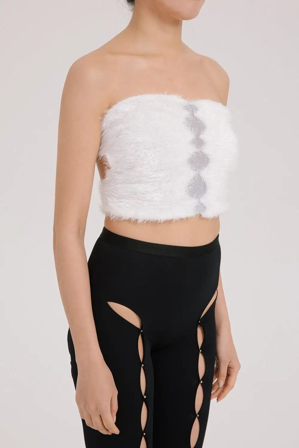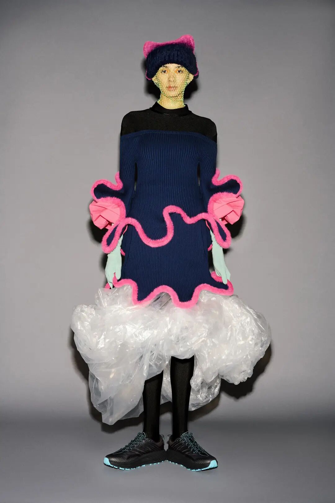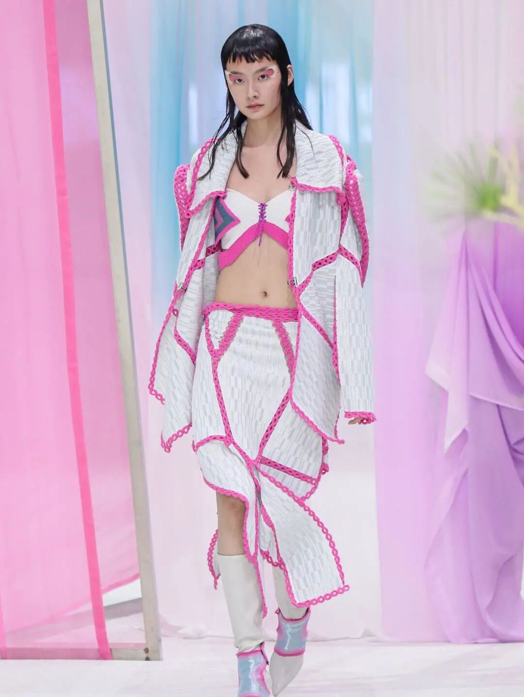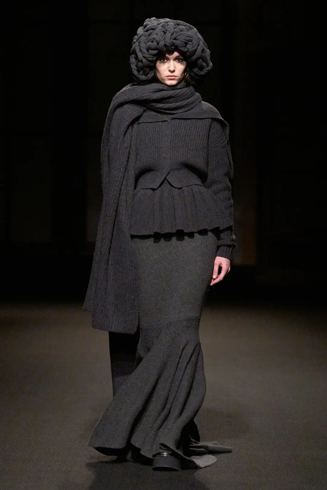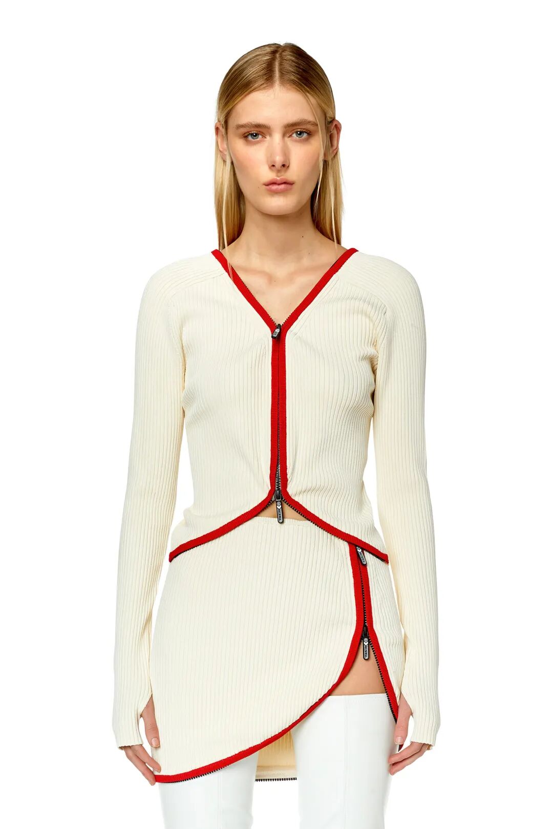 新季的针织半裙更加注重对下摆的不规则造型设计,如方形垂坠下摆、不规则切割、波浪形下摆等,非常规形式的编织与裁剪使得针织半裙这一常见单品更加个性、时尚。