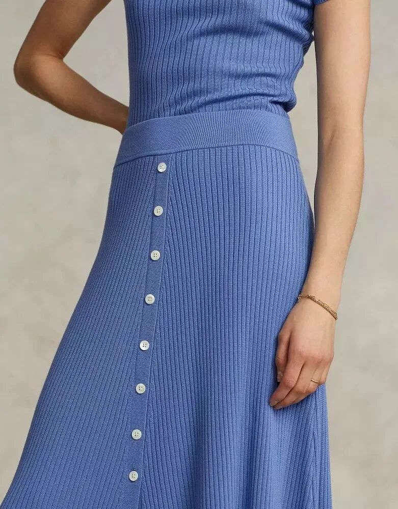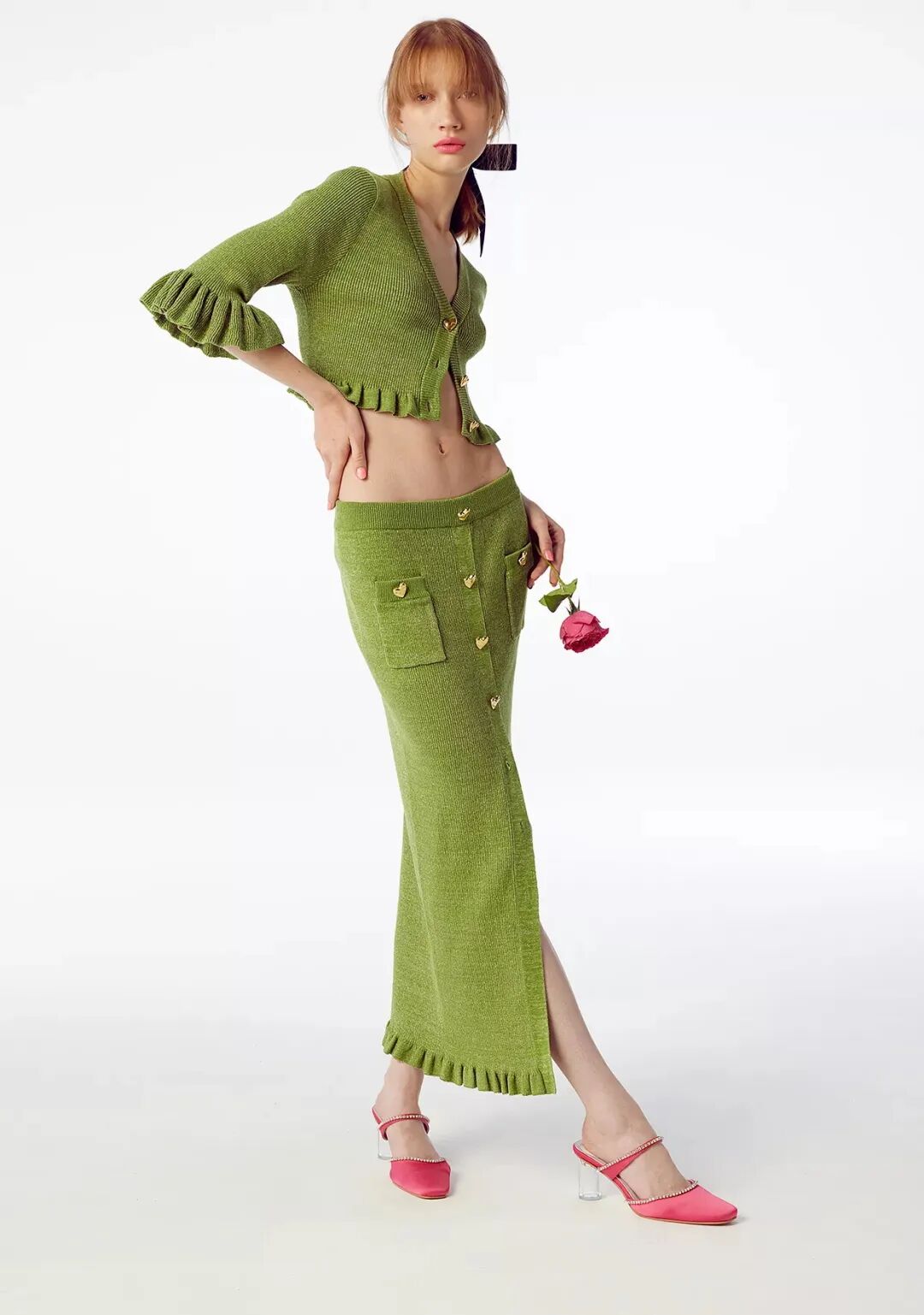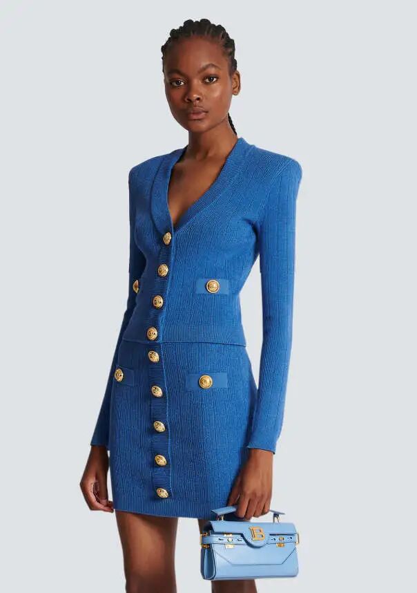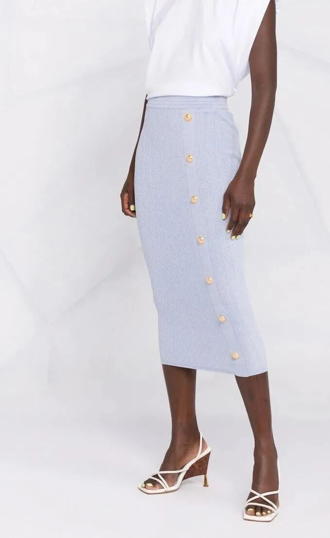 针织半裙的钉扣不止方便开合,还可以起到装饰的作用。扣饰可从颜色、材质、形状、大小等多方面进行设计,亮色金属扣饰比较霸气醒目,同色系扣饰使整体显得和谐统一,小扣饰点缀则使裙装更加精致。