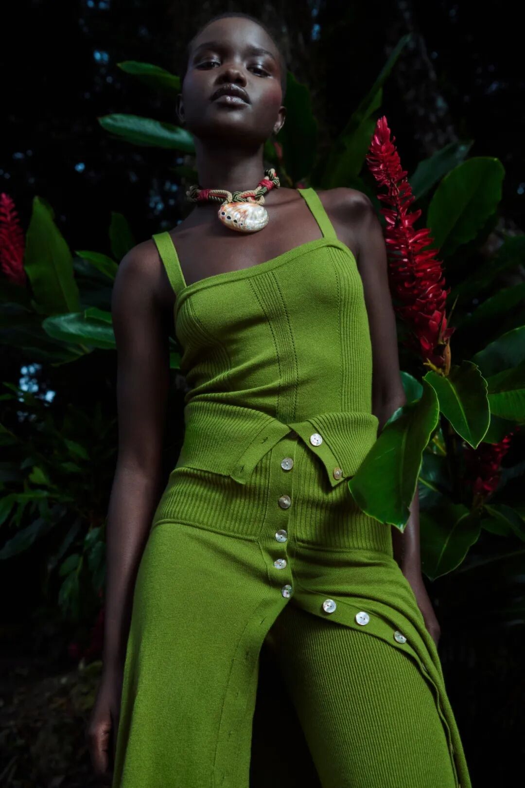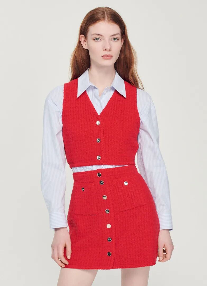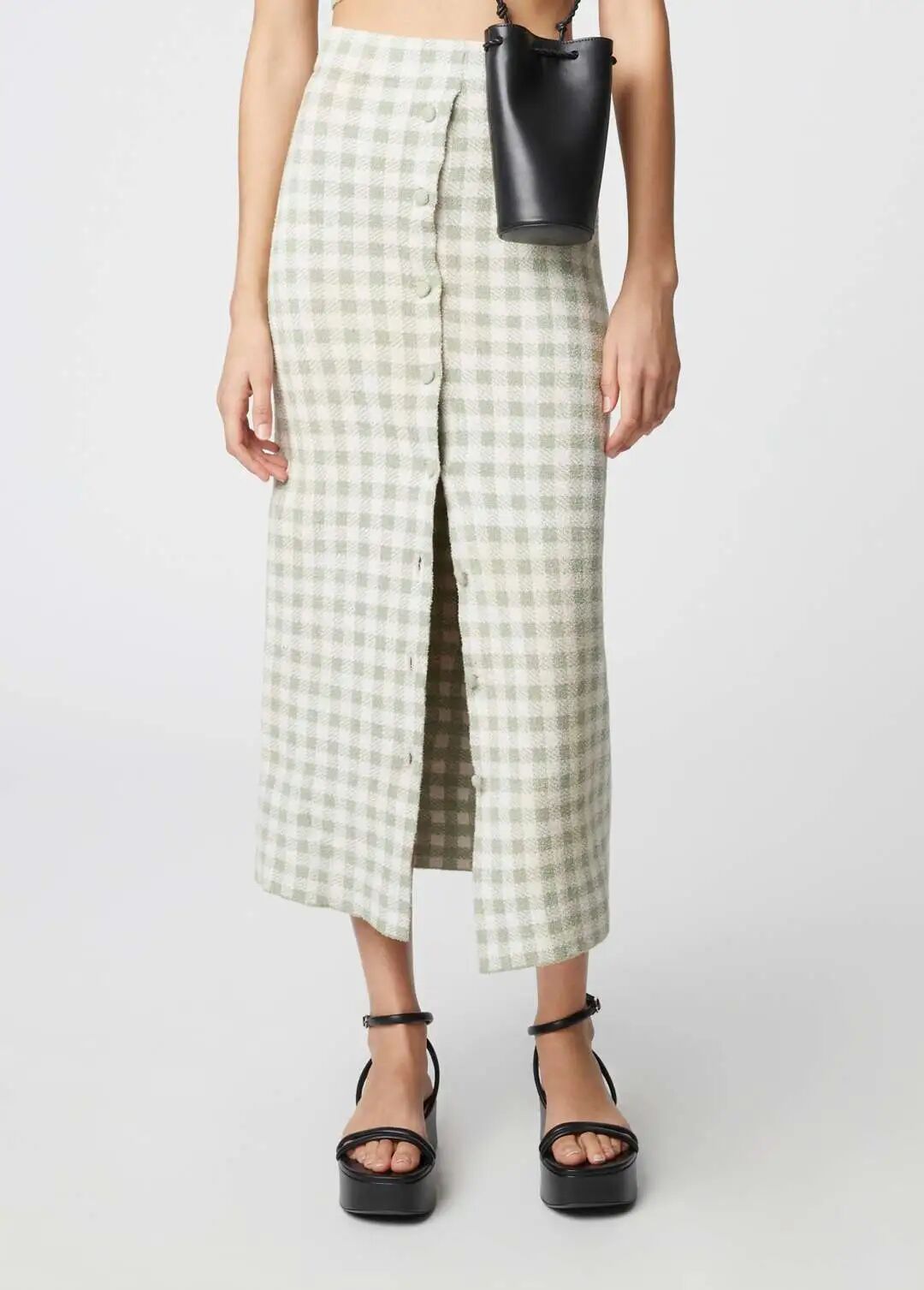 针织半裙的钉扣不止方便开合,还可以起到装饰的作用。扣饰可从颜色、材质、形状、大小等多方面进行设计,亮色金属扣饰比较霸气醒目,同色系扣饰使整体显得和谐统一,小扣饰点缀则使裙装更加精致。