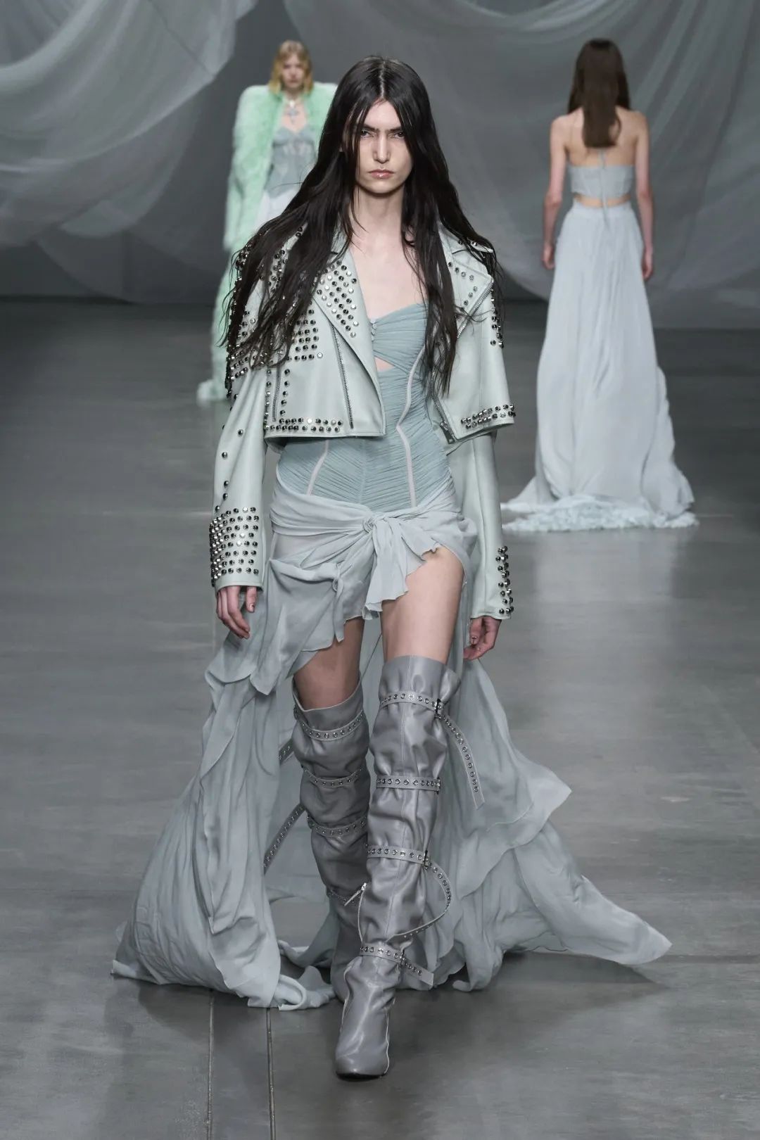 浪漫轻史主题女装将古典与朋克态度完美融合,营造古今交错的感觉,优雅中散发强而有力的叛逆。无论是对于传统元素和的运用,或是对于舞者姿态的诠释,为少淑女风格增加更多文化底蕴。金属元素以及抽象与原始的粗砾质感在音乐派对中散发的熠熠光辉。
