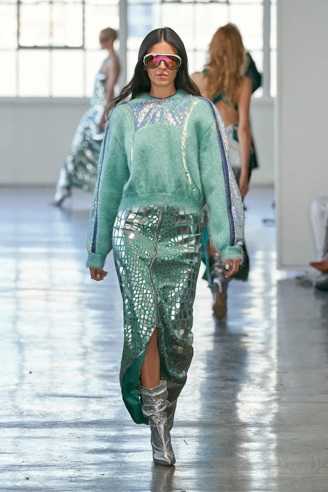 星纪元主题下的女装设计,呈现出独具个性的蓬松感和未来光泽感。设计师将复古朋克的元素巧妙地融入其中,打造出视觉、体验和创意等多维度的全新设计灵感。这种设计风格不仅独特,还非常前卫,适合现代年轻女性的审美需求,为时尚界注入了全新的活力。