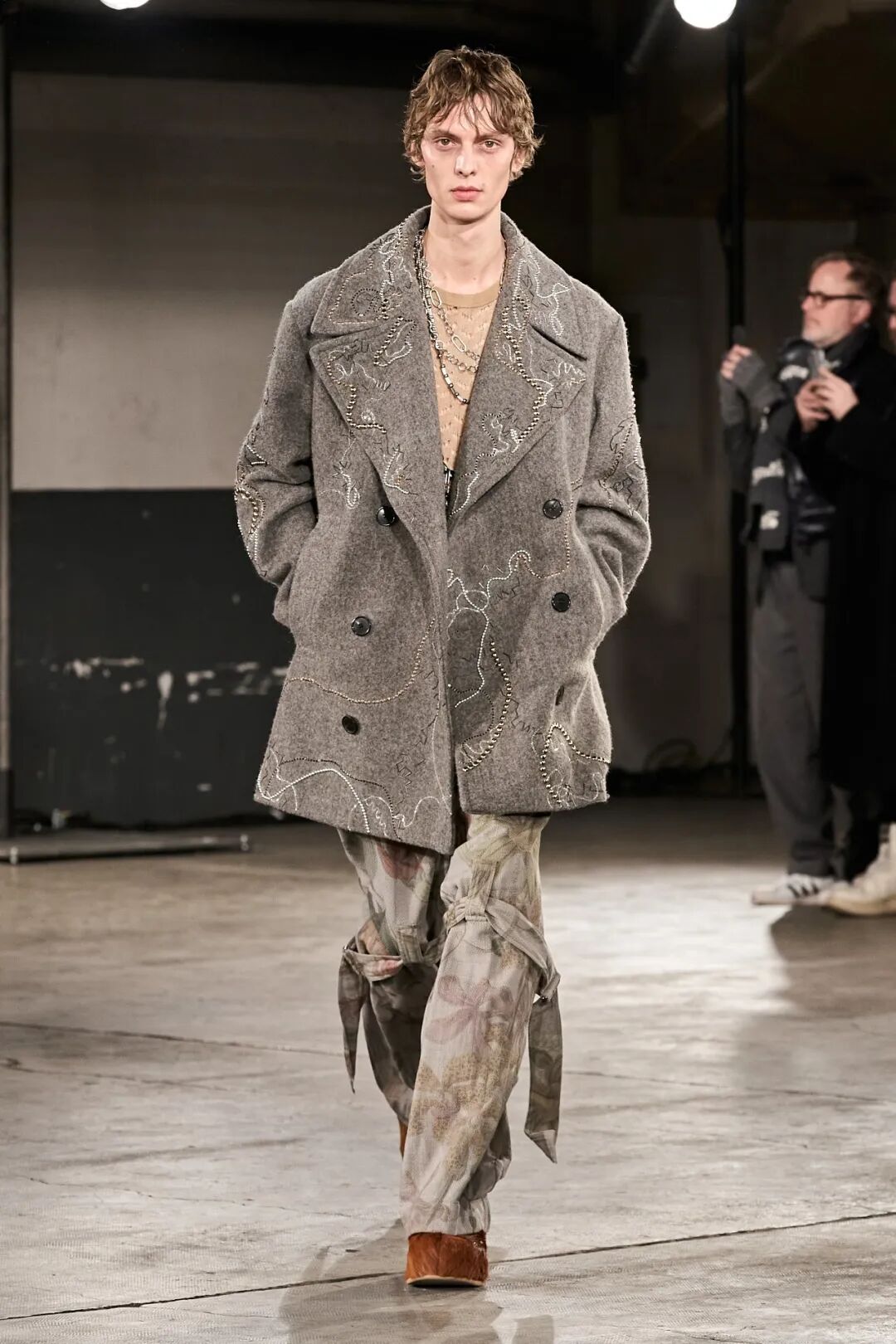 浪漫轻史主题男装将工艺和剪裁与时装艺术的表达完美糅合。手工钉珠等装饰于高品质单品之上,繁复的创新设计和层叠穿搭方式,增添了更多趣意与浪漫的气息。极具历史感的沉稳色调融合朋克、摇滚、肆意盛放的花卉图案,形成巧妙的平衡感。