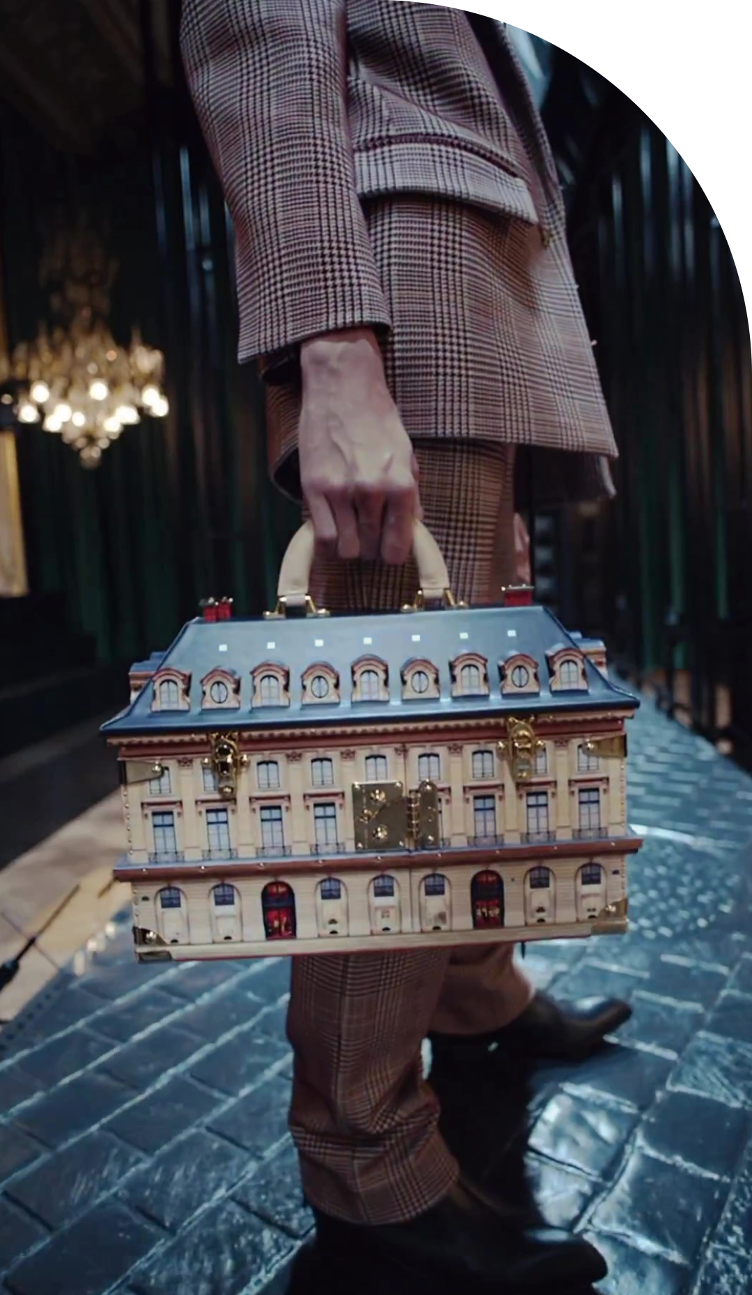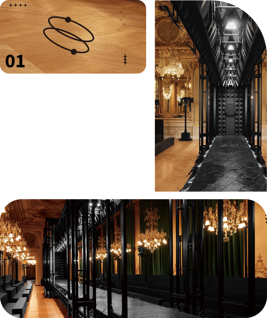 创意总监 Nicolas Ghesquière 与视觉艺术家 Philippe Parreno 等多位艺术家合作,将巴黎街道搬进奥塞美术馆中。Nicolas Becker 透过街道上行人及车水马龙的声音为背景,加入雨滴、喇叭声和狗吠等环境音效,真实还原出城市街景,与金光熠熠的空间形成有趣的对比。步入古典与现代、传统与文化交织的世界,演绎跨越时代的艺术美感与辉煌的回响。