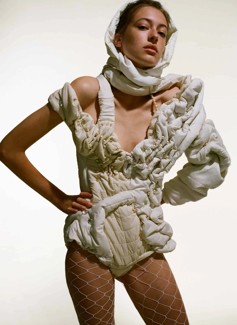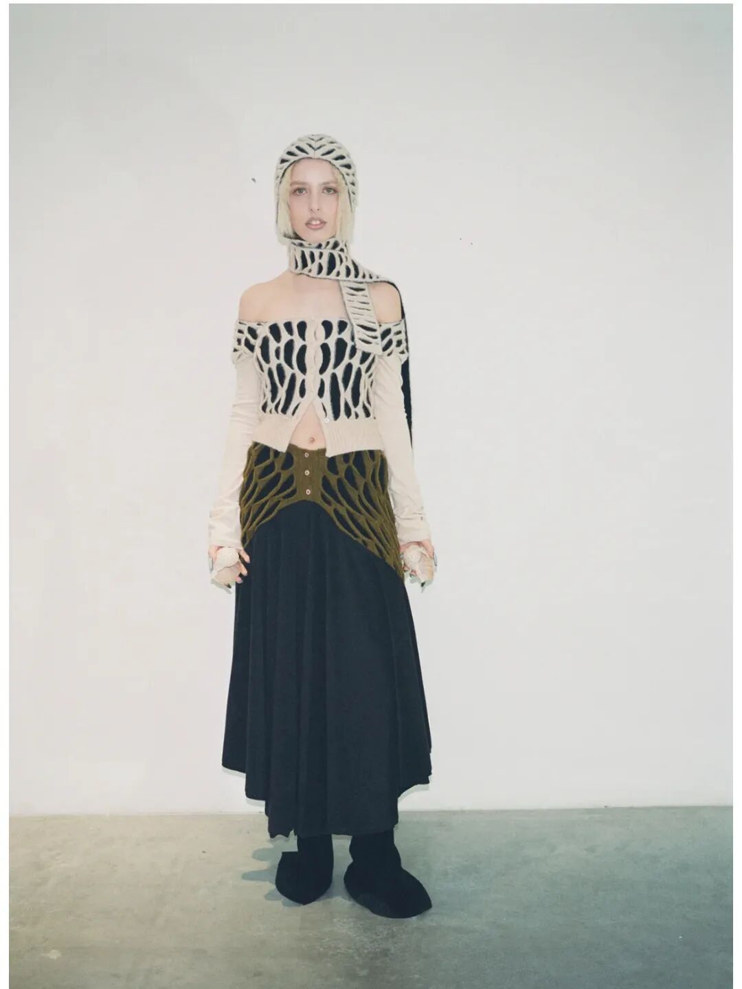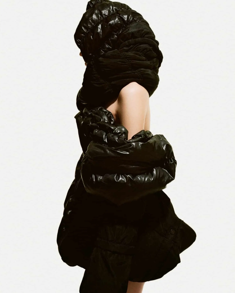 RUI 23SS秋冬系列以「无尽长河的尽头」为主题,rui企图通过描述“壳”的质感创造一种封闭的私人体验,充满包裹感的曲线结构以母体的象征符号出现在柔软的廓形之中。