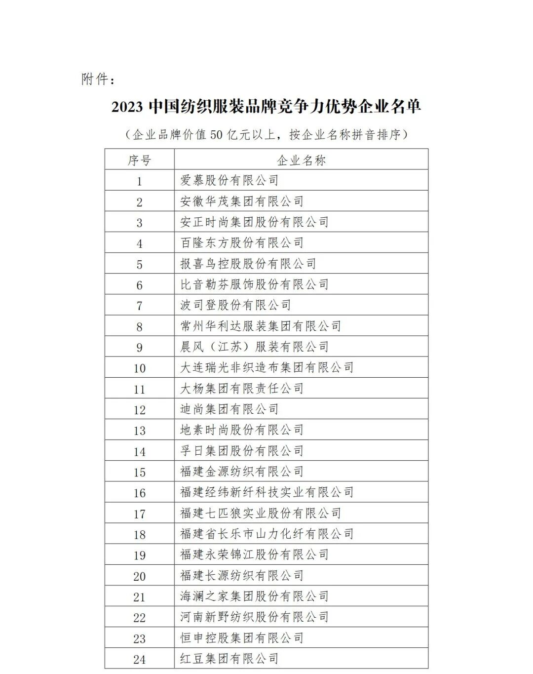 “多年来,行业持续完善品牌培育和推广体系,形成了制造品牌、消费品牌和区域品牌协同发展的生动局面。”国际纺织制造商联合会主席、中国纺织工业联合会会长孙瑞哲指出,在中华优秀传统文化的挖掘与应用中,在同世界优秀文明的交流与互鉴中,中国时尚的感染力、渗透力不断提升,自主品牌的认知度与影响力持续增强,中国已经成为全球时尚的重要一极。国家发展和改革委员会产业发展司副司长龚桢梽出席本次论坛并致辞。论坛上发布的“2023中国纺织服装品牌竞争力优势企业”(名单后附),无一不是其中的杰出代表。中国纺织工业联合会副会长杨兆华在现场介绍说,通过系统评估,共80家企业品牌价值超过50亿元,确定为“2023中国纺织服装品牌竞争力优势企业”。据介绍,中国纺织工业联合会将持续深化品牌竞争力评价工作,助力品牌影响力与竞争力提升。此次论坛由中国纺织工业联合会品牌工作办公室副主任屈飞主持。