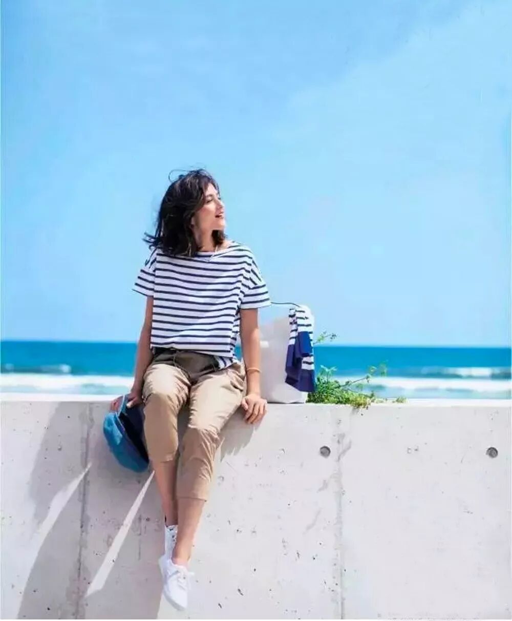 蓝白条纹T配卡其色裤子很有休闲度假感。