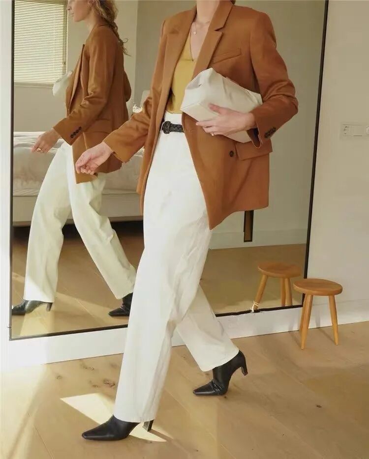 卡其色与藏蓝色,两个高级色配在一起,气质立显。