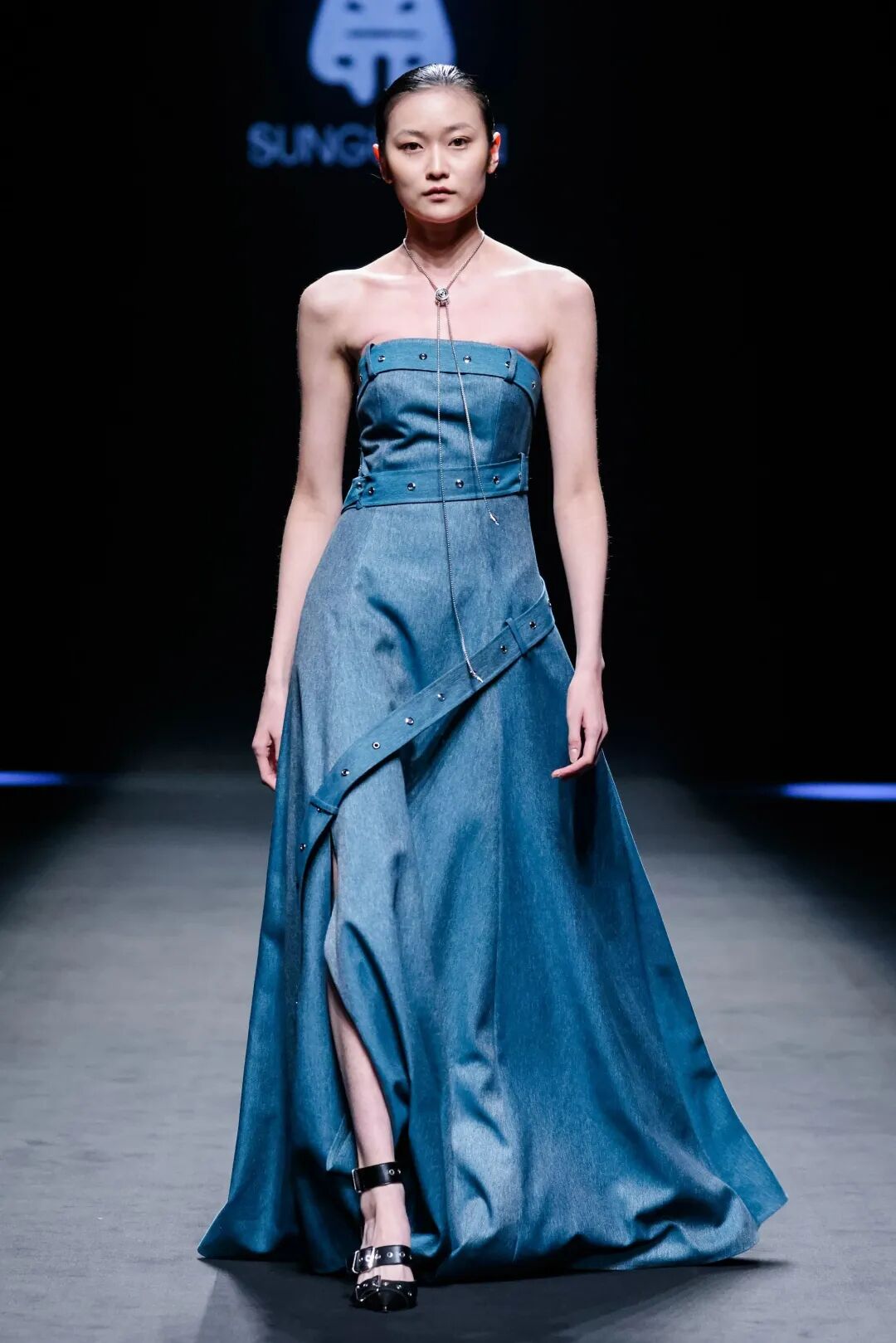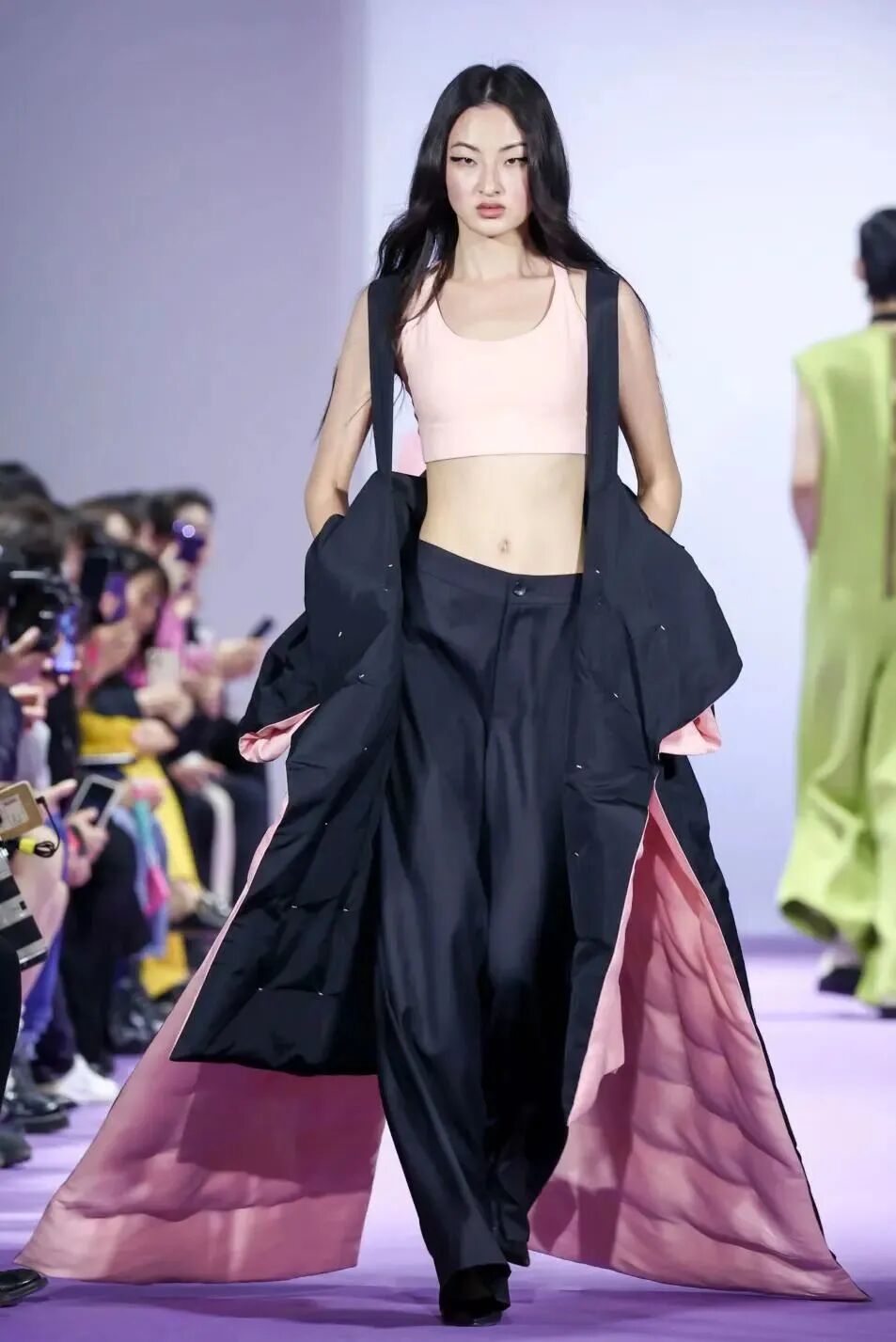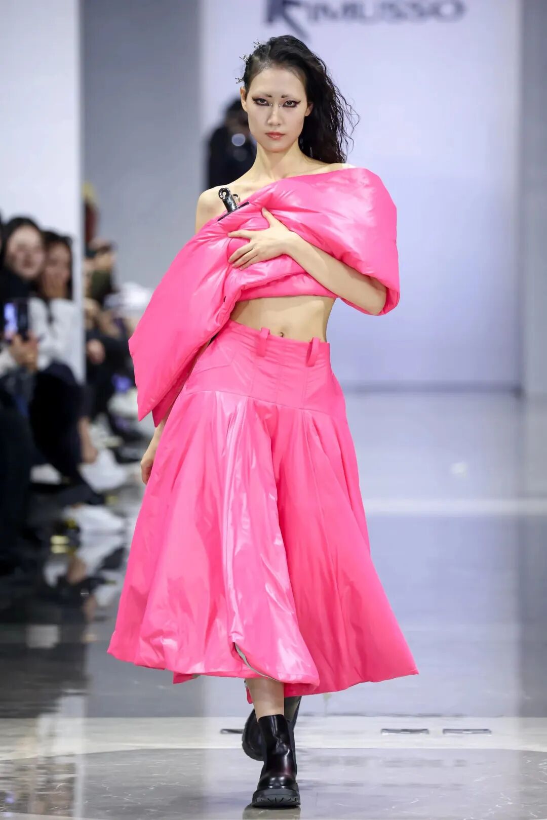 Beatyberry、QIIIANNNL选用绗缝羽绒/棉增加体量感,SARAWONG与绸都盛泽风尚则选用较为飒爽硬挺的工装面料,搭配抹胸、背心、一字领等较为轻盈的上装设计,白鹿语、KIMUSSO、SUNGUITIAN的超A廓形羽绒服、羽绒裙、牛仔裙打破了这两类面料厚重的传统印象,在营造夸张的视角效果时又时髦得毫不费力。