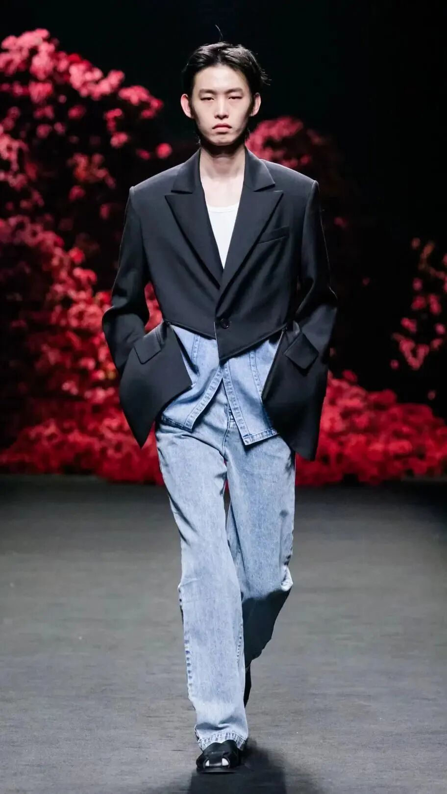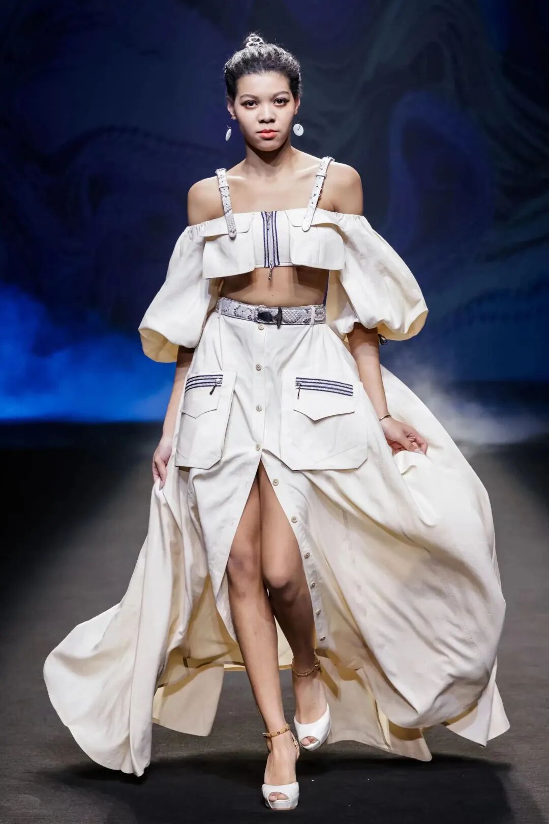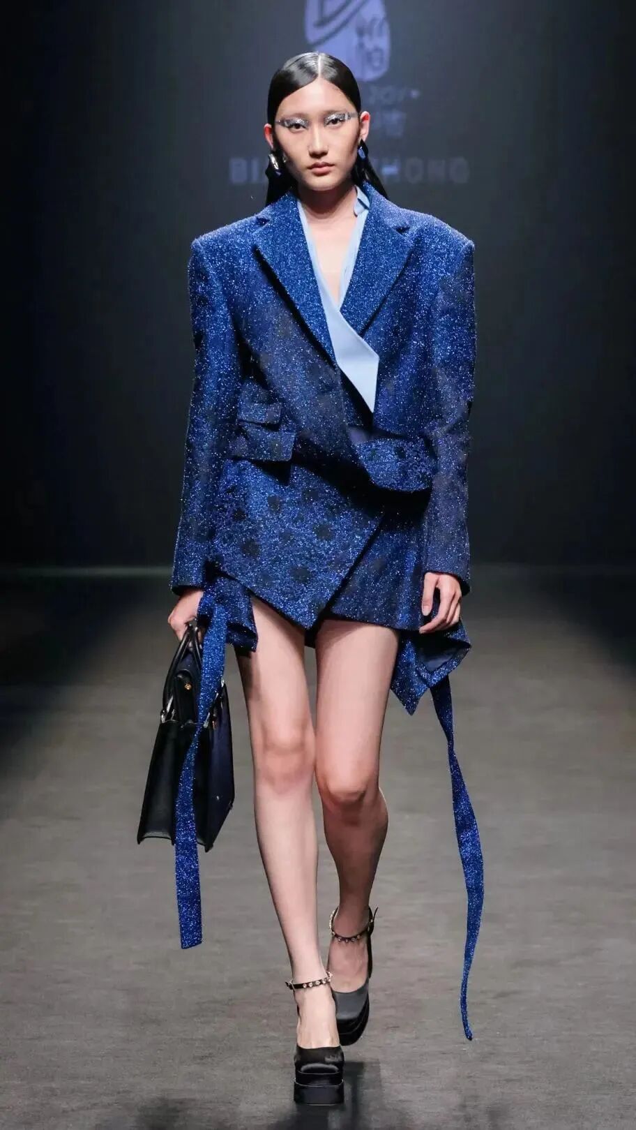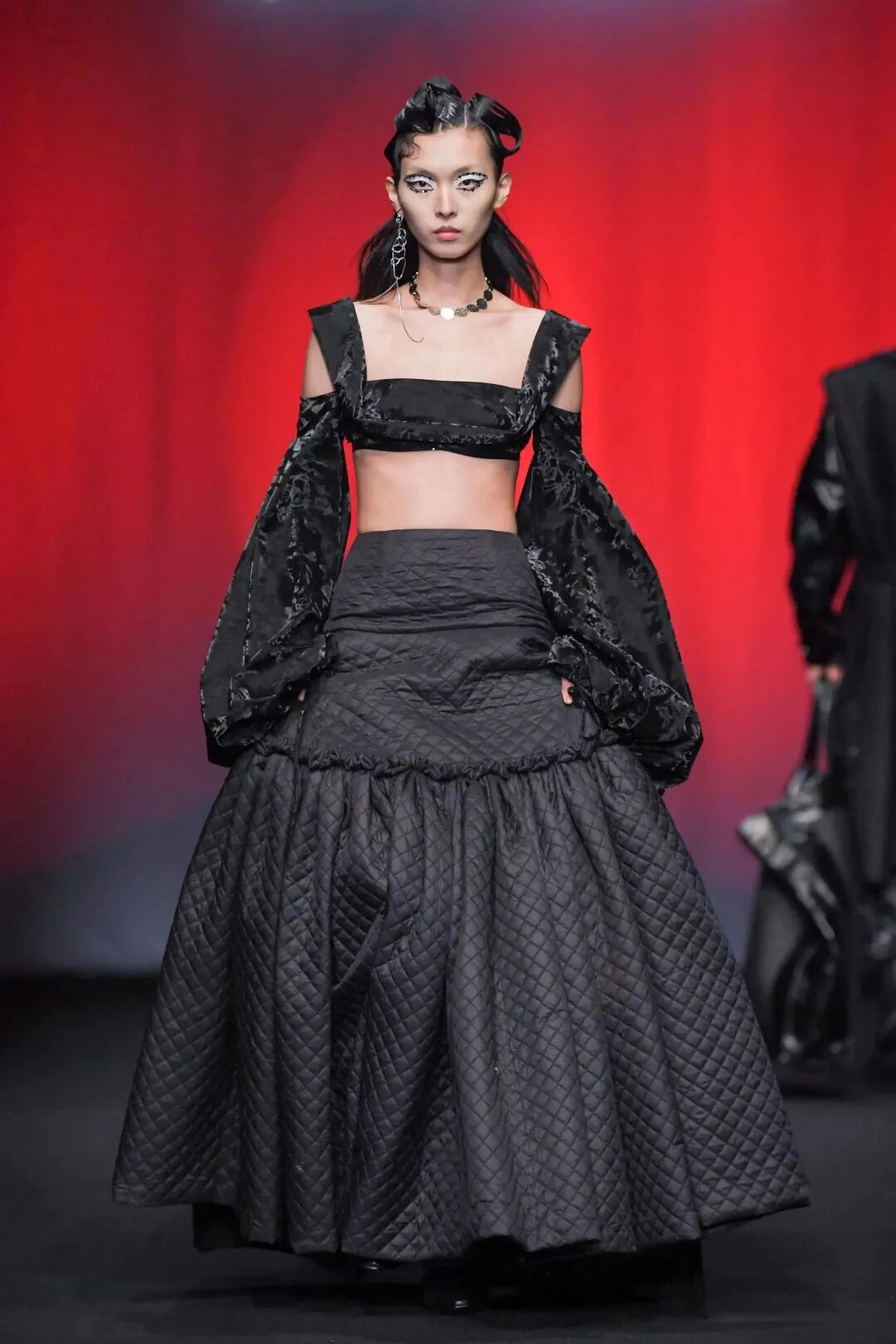 Beatyberry、QIIIANNNL选用绗缝羽绒/棉增加体量感,SARAWONG与绸都盛泽风尚则选用较为飒爽硬挺的工装面料,搭配抹胸、背心、一字领等较为轻盈的上装设计,白鹿语、KIMUSSO、SUNGUITIAN的超A廓形羽绒服、羽绒裙、牛仔裙打破了这两类面料厚重的传统印象,在营造夸张的视角效果时又时髦得毫不费力。
