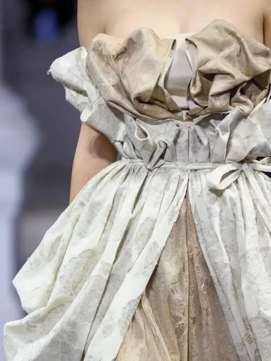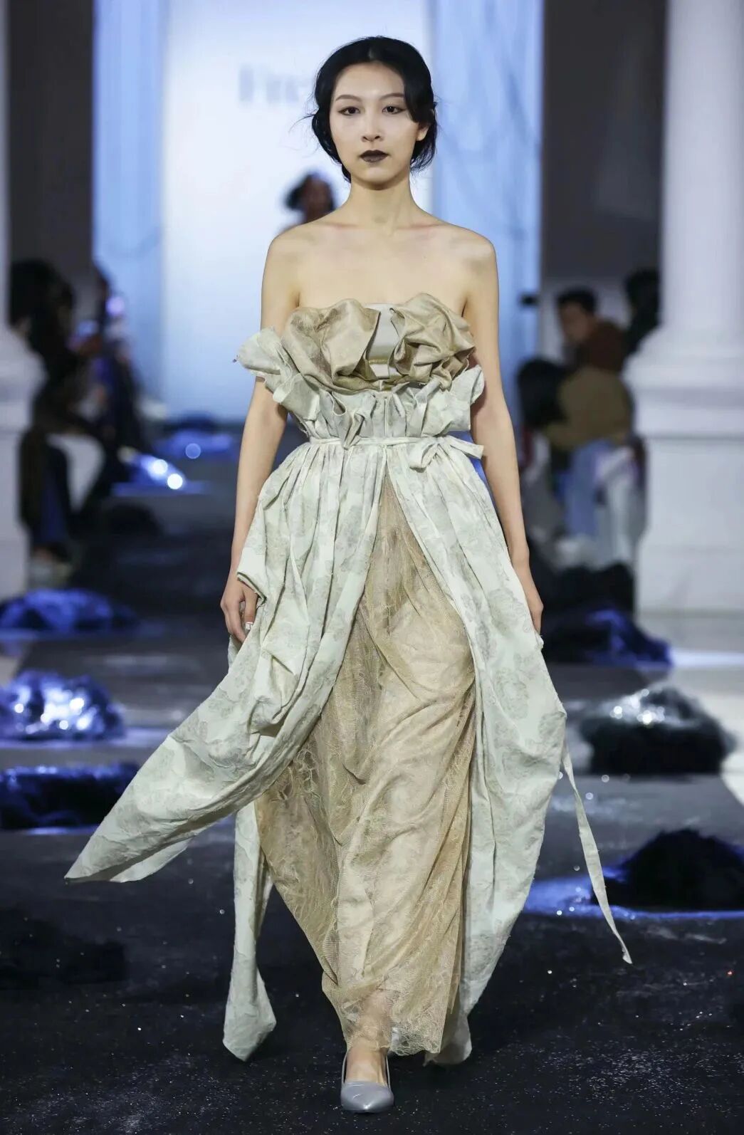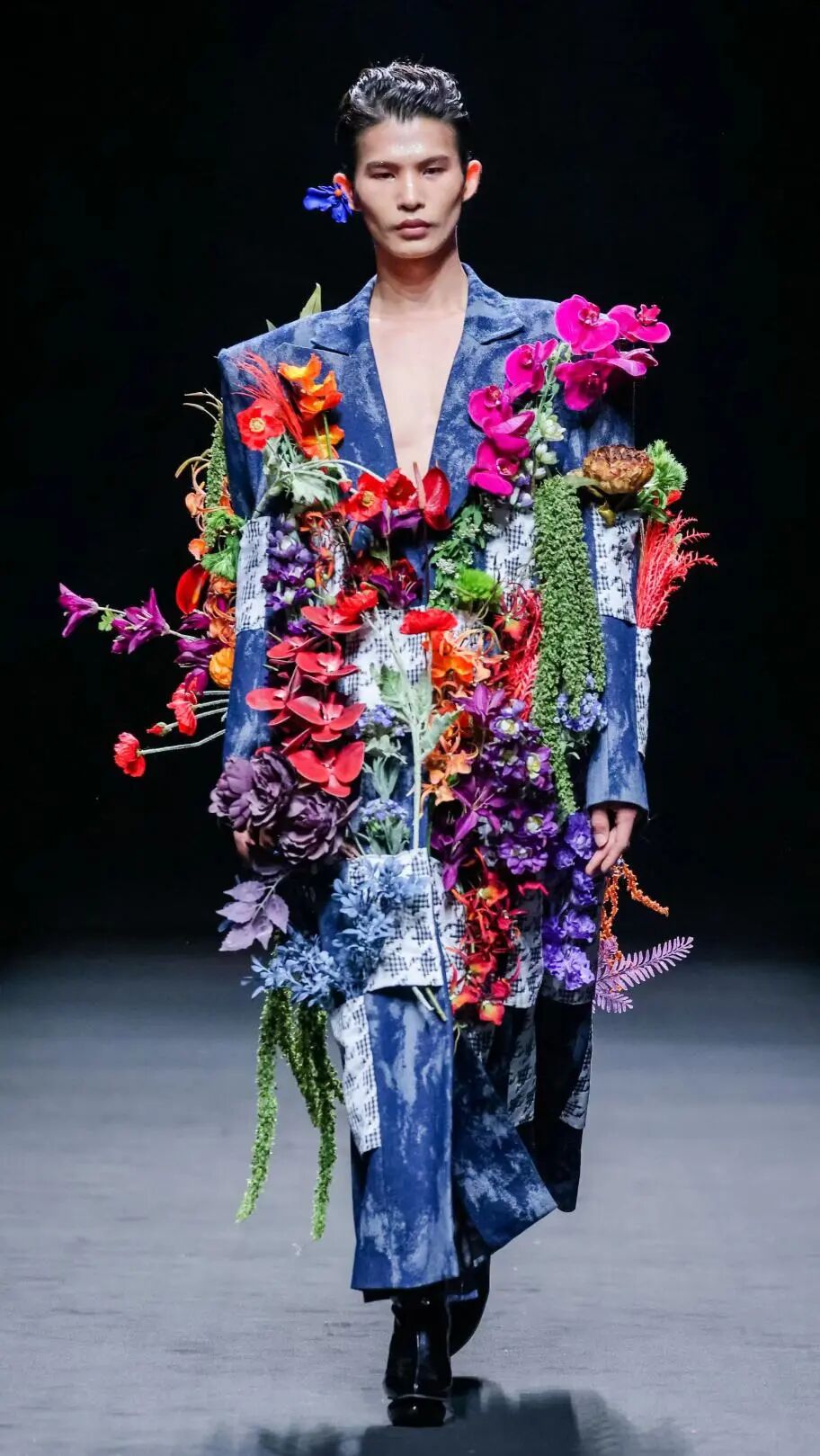山谷少年与CHICCO MAO将真实的麦穗与花朵形象装饰于服装上,引起强烈的自然审美共鸣。花苞裙与腰线以上的花瓣绽放效果让馥芮雅的立体花朵廓型更多的体现女性的美丽与坚韧,在秀场中缓缓走来的她不惧黑夜与孤独。