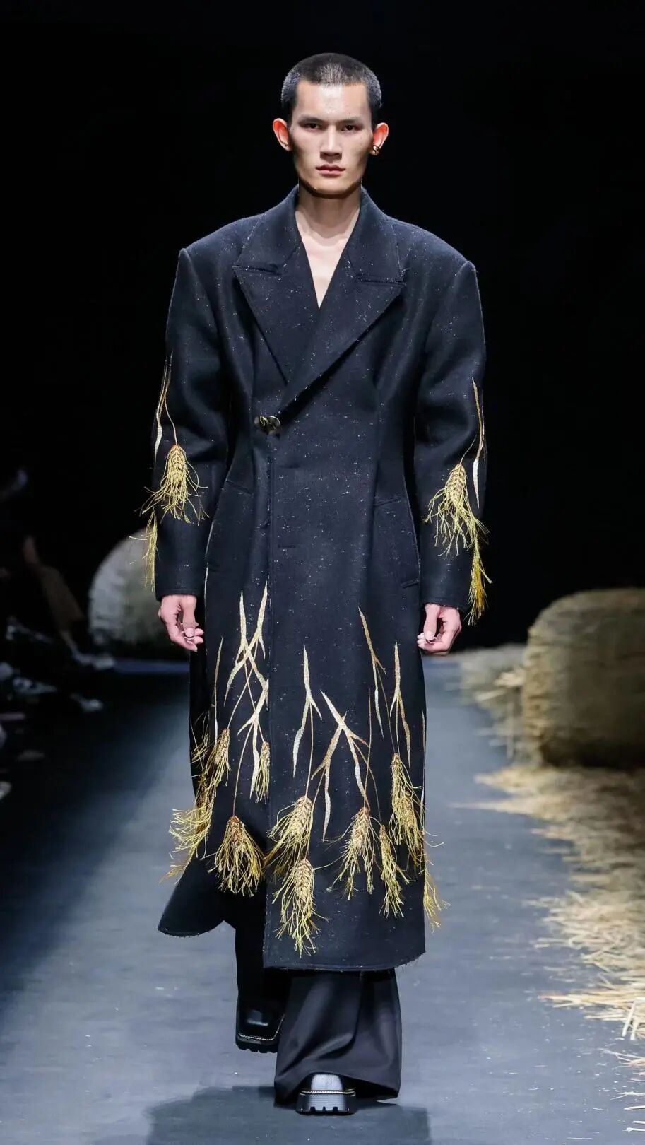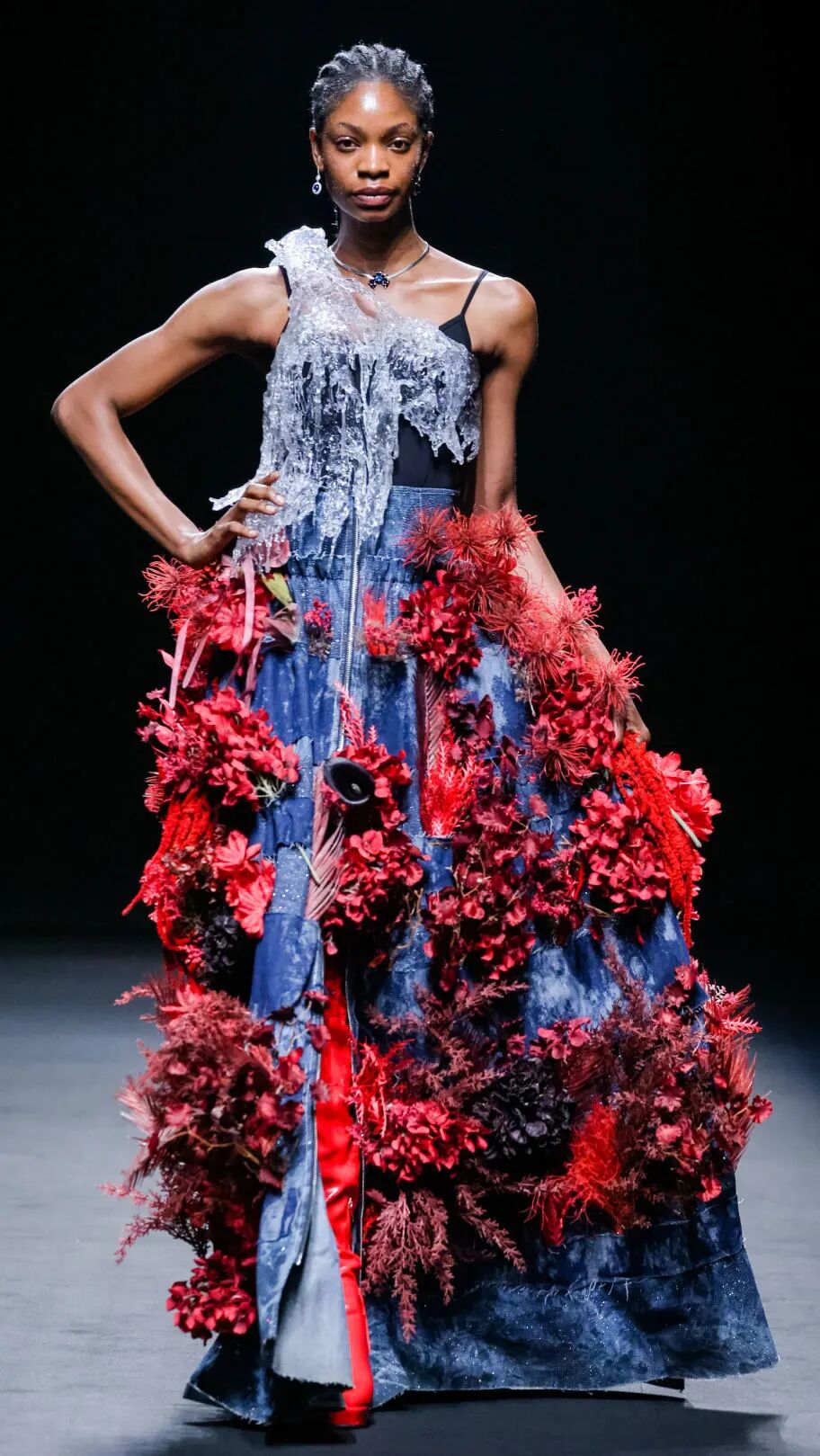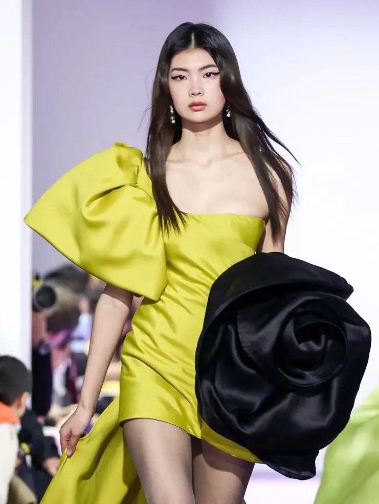 山谷少年与CHICCO MAO将真实的麦穗与花朵形象装饰于服装上,引起强烈的自然审美共鸣。花苞裙与腰线以上的花瓣绽放效果让馥芮雅的立体花朵廓型更多的体现女性的美丽与坚韧,在秀场中缓缓走来的她不惧黑夜与孤独。