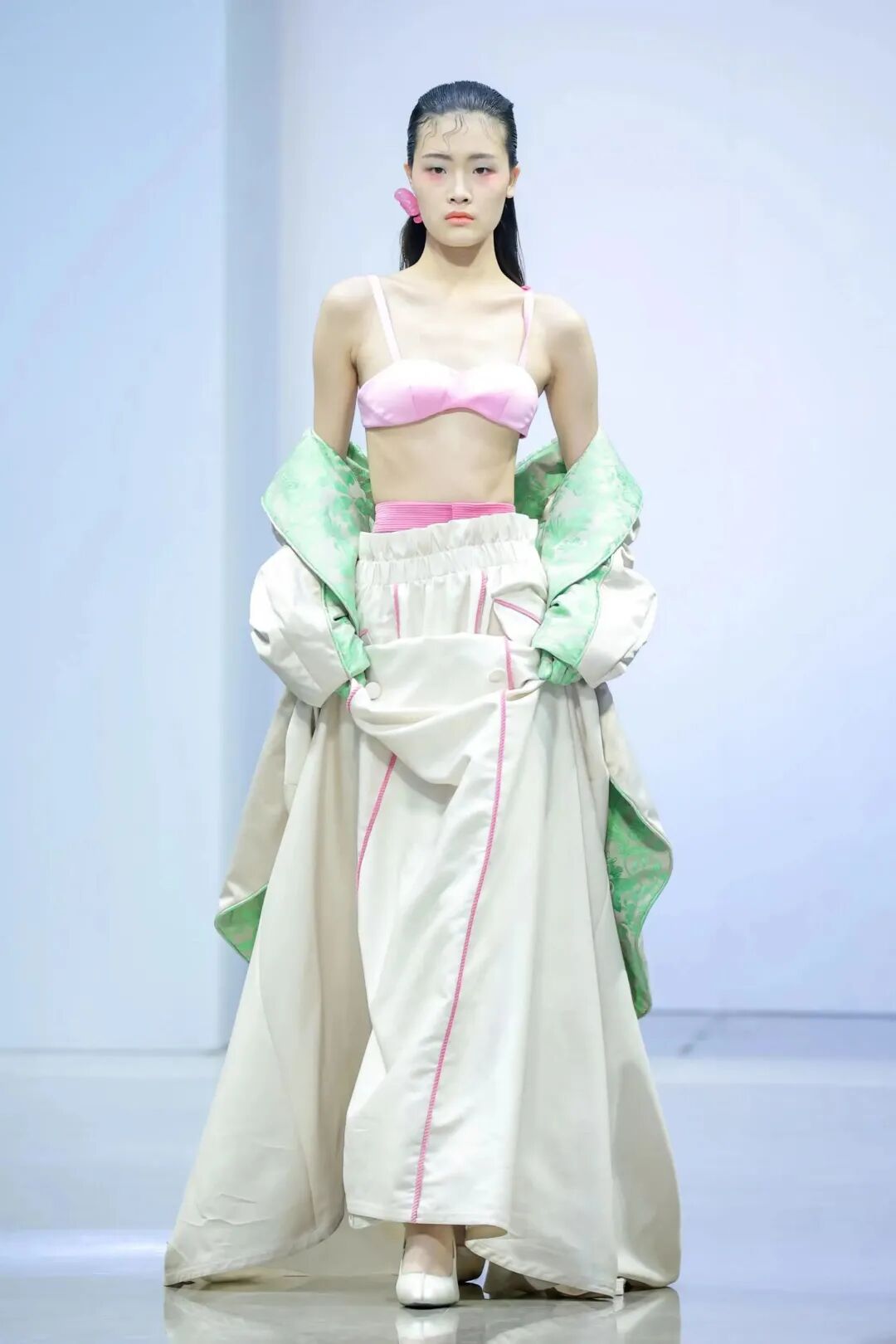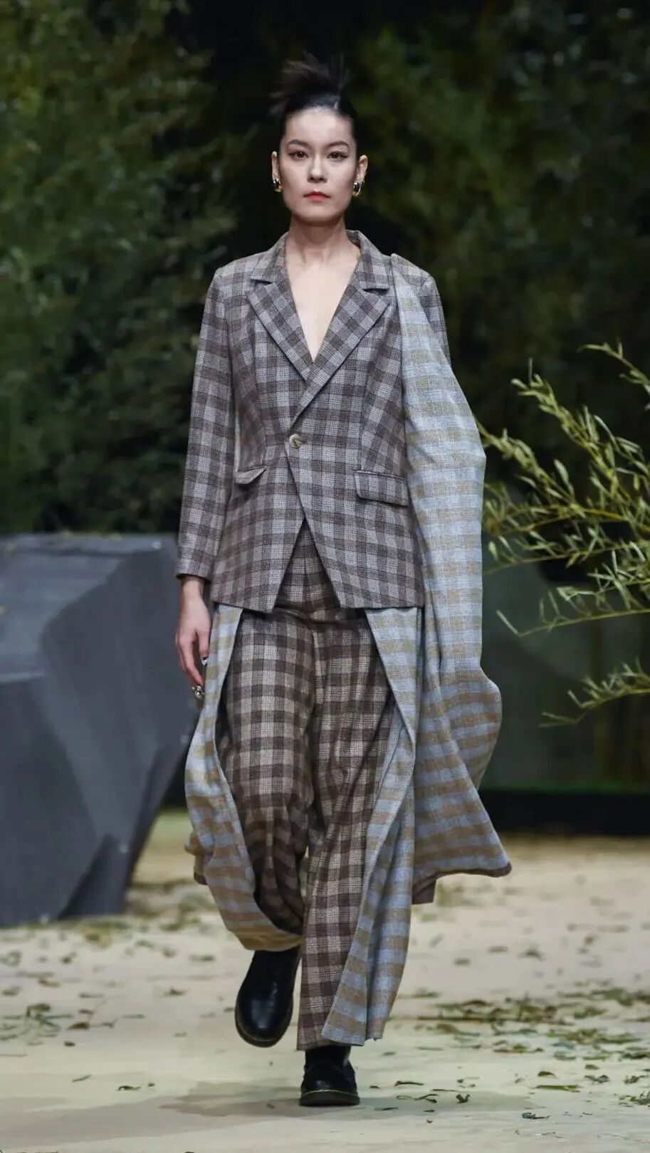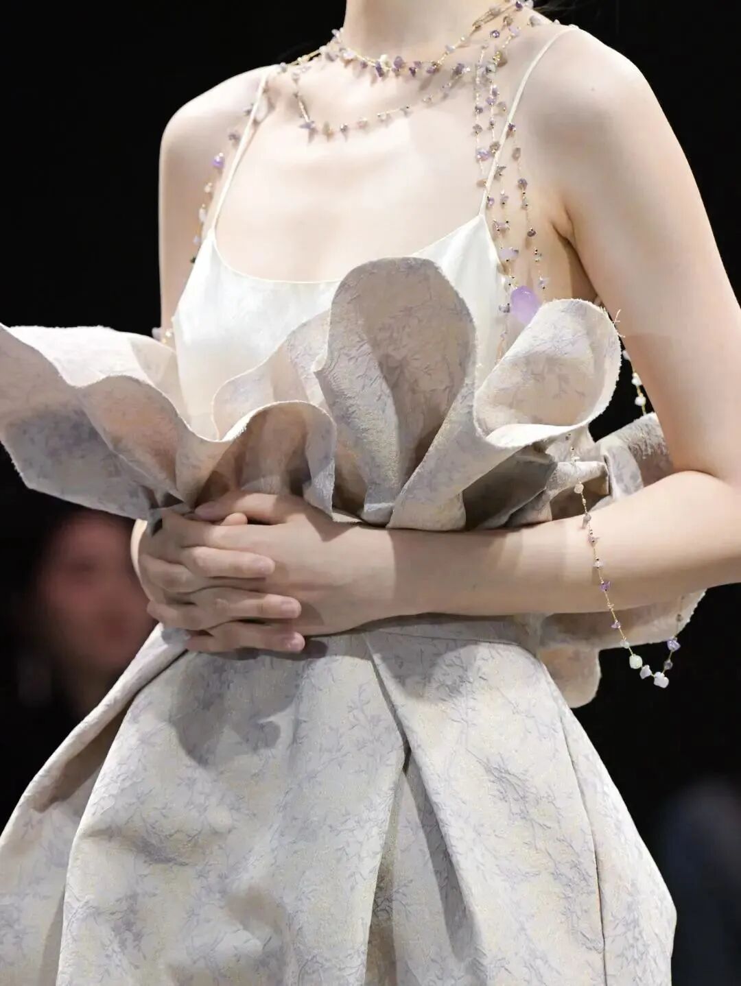 Pastoral Poetry设计敦煌纹样前搭片,增添了精致感;MOHANYUN的叠层设计用一深一浅同款色织格纹所体现,用面料的“里”和“外”的双重性演绎结构,重塑解构与秩序美。ZICKNESS则选用不同面料以荷叶边等形式展示服装结构“打开”的状态,通过光泽、肌理对比丰富视觉层次,更具有流动性。