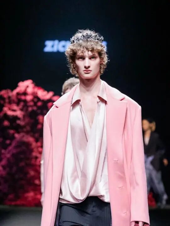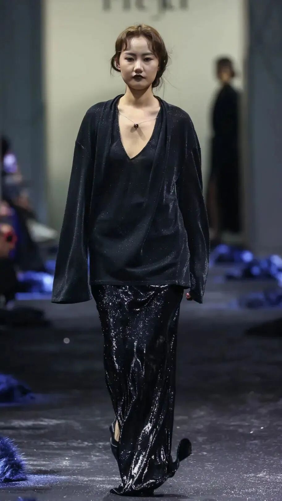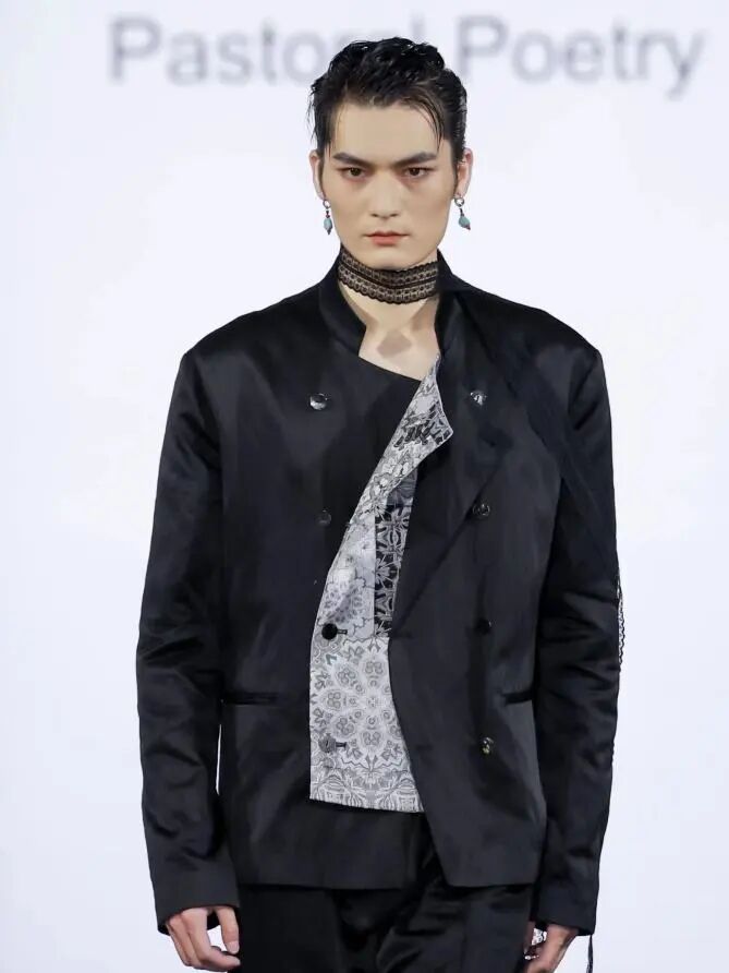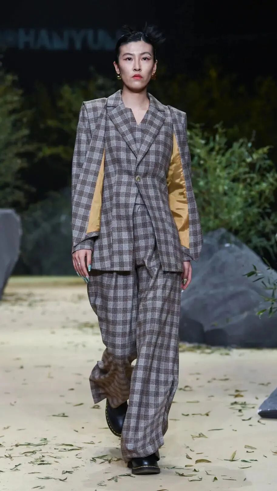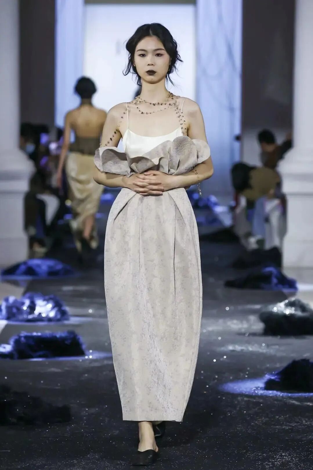 Pastoral Poetry设计敦煌纹样前搭片,增添了精致感;MOHANYUN的叠层设计用一深一浅同款色织格纹所体现,用面料的“里”和“外”的双重性演绎结构,重塑解构与秩序美。ZICKNESS则选用不同面料以荷叶边等形式展示服装结构“打开”的状态,通过光泽、肌理对比丰富视觉层次,更具有流动性。